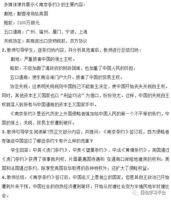 1.教师指出:1842年8月,清政府被迫与英国签订了中国近代史上第一个丧权辱国的不平等条约──中英《南京条约》。