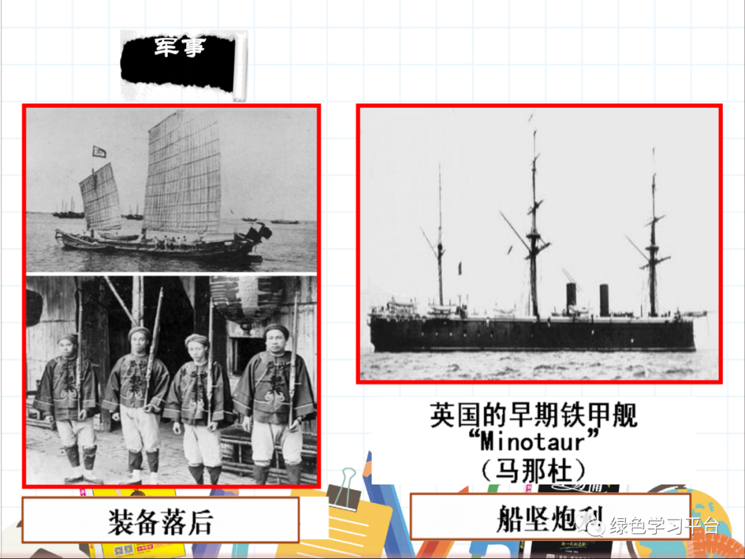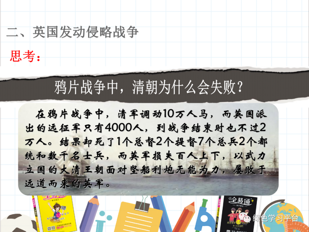 教师:鸦片战争以大清王朝的的失败而结束,其实当时英国派往中国作战的士兵前后不过万人,而清王朝派往南方作战的兵力超过10万人,但却打了败仗,其原因有哪些?