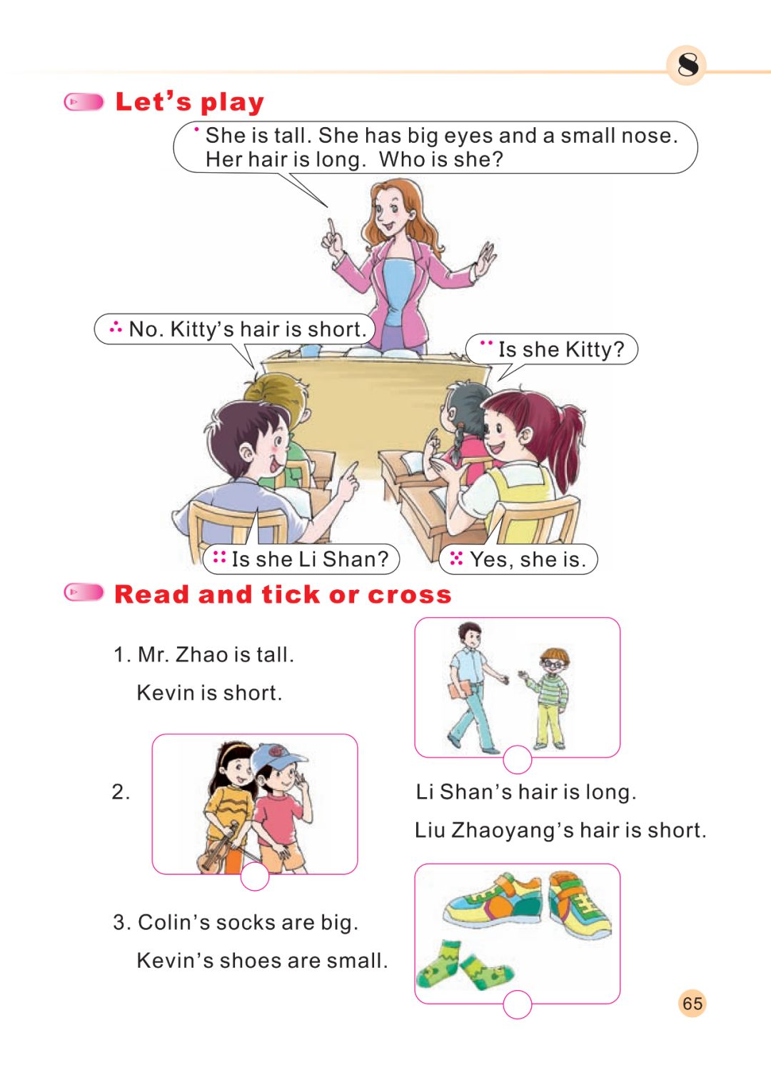A. My teacher is tall and thin. B. My teacher is short and fat.