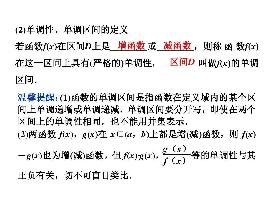 若函数y=f(x)在某个区间是增函数或减函数,则就说函数在这一区间具有(严格的)单调性,这一区间叫做函数的单调区间.此时也说函数是这一区间上的单调函数。
