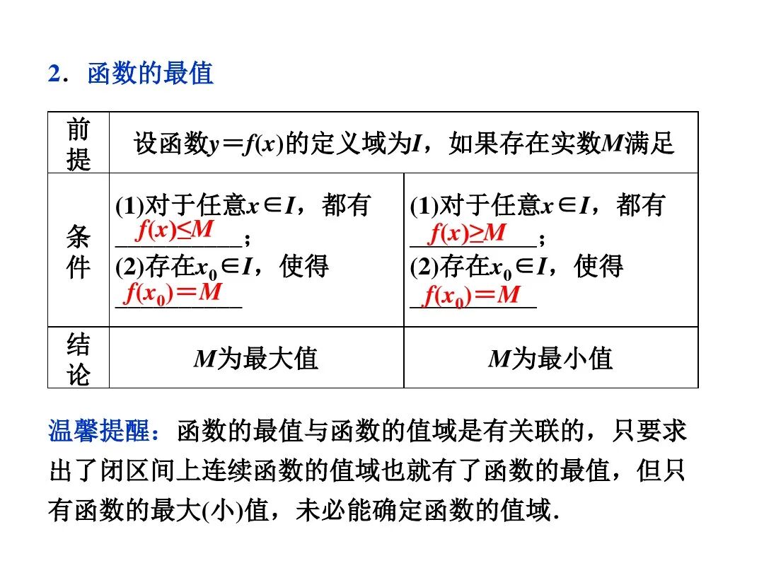 ②存在x0∈d。使得f (x0)=M,那么,我们称实数M 是函数y=f(x)的最大值。