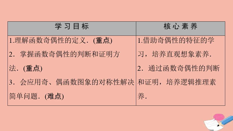 1. 知识与技能目标:理解函数的奇偶性及其几何意义,掌握判断函数奇偶性的方法。