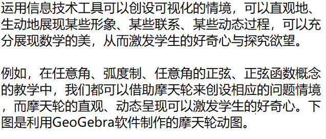 再譬如,在△ABC中探索的几何意义。让a边固定、A角的大小固定,则三角形的形状不定,那么有什么相关几何量是不变的呢?利用GeoGebra软件作出动顶点A的轨迹,然后得出猜想:顶点A的轨迹是圆弧,即三角形的外接圆的半径是确定的,然后得到关于