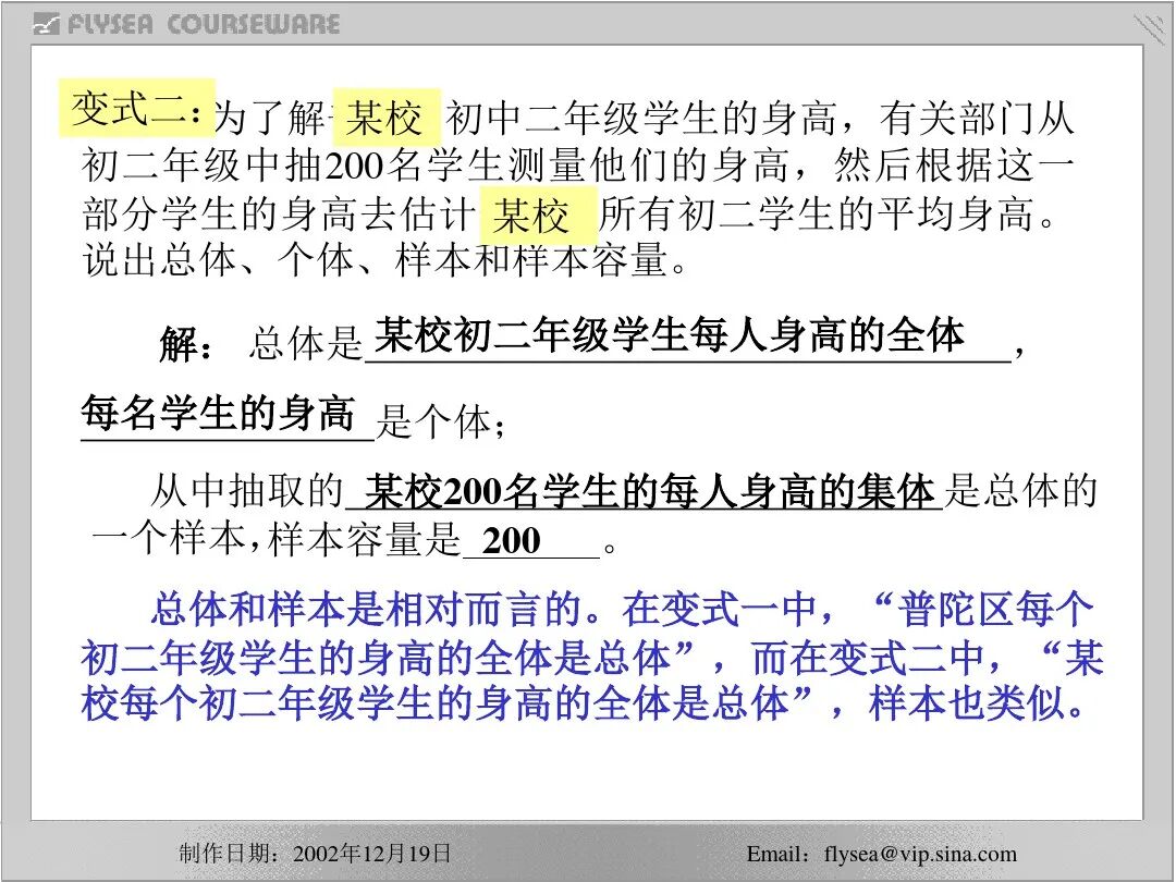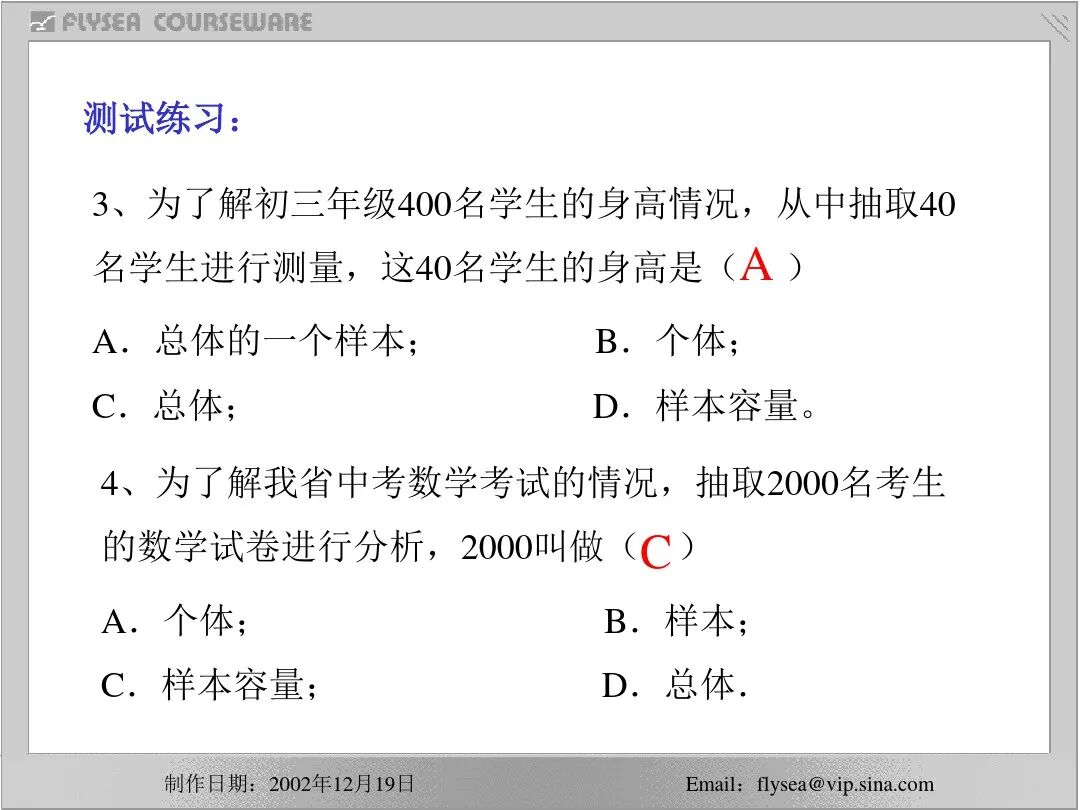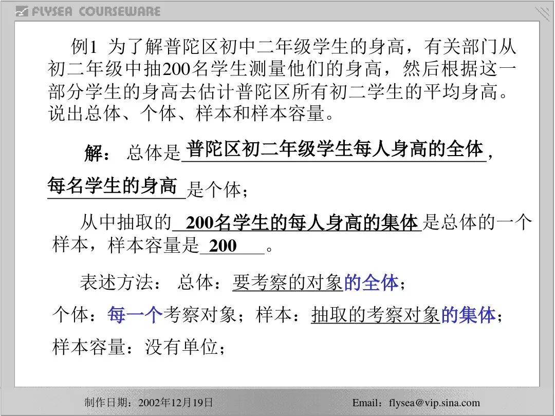 在对数据进行统计时,我们把所要考察对象的全体叫做总体,其中的每一个考察对象叫做个体,从总体中所抽取得一部分个体叫做总体的一个样本,样本中个体的数量叫做样本容量.
