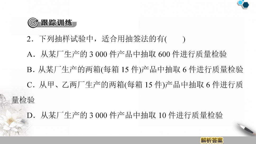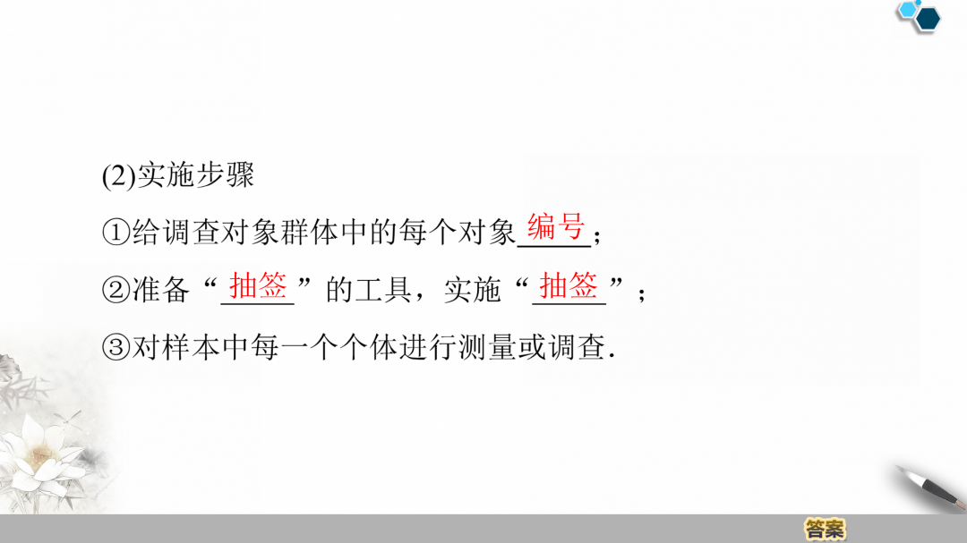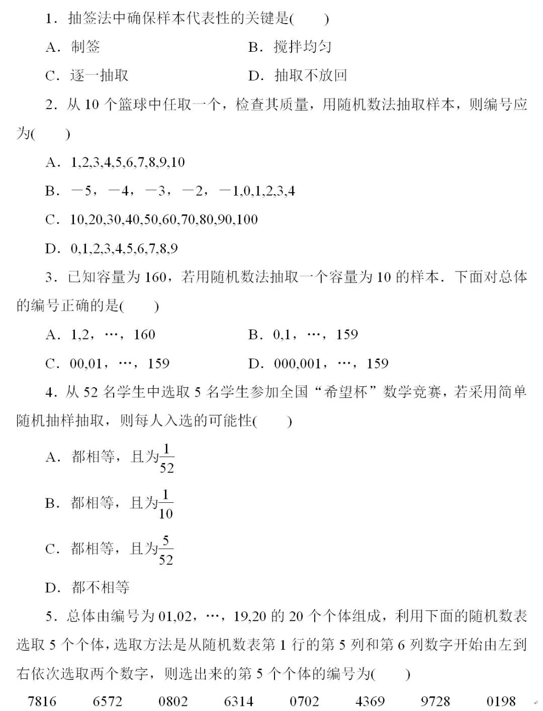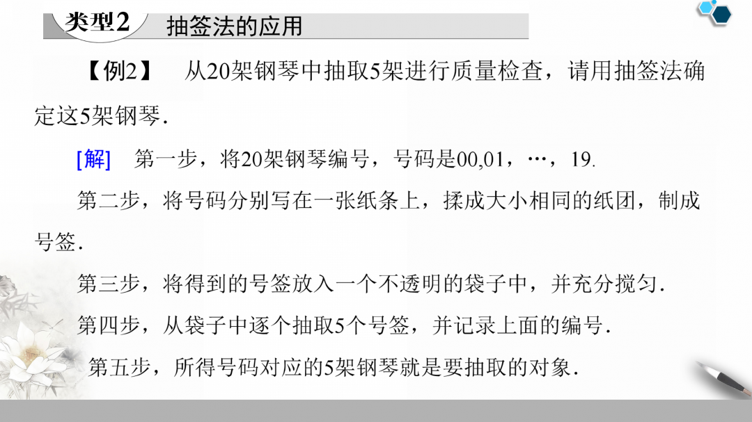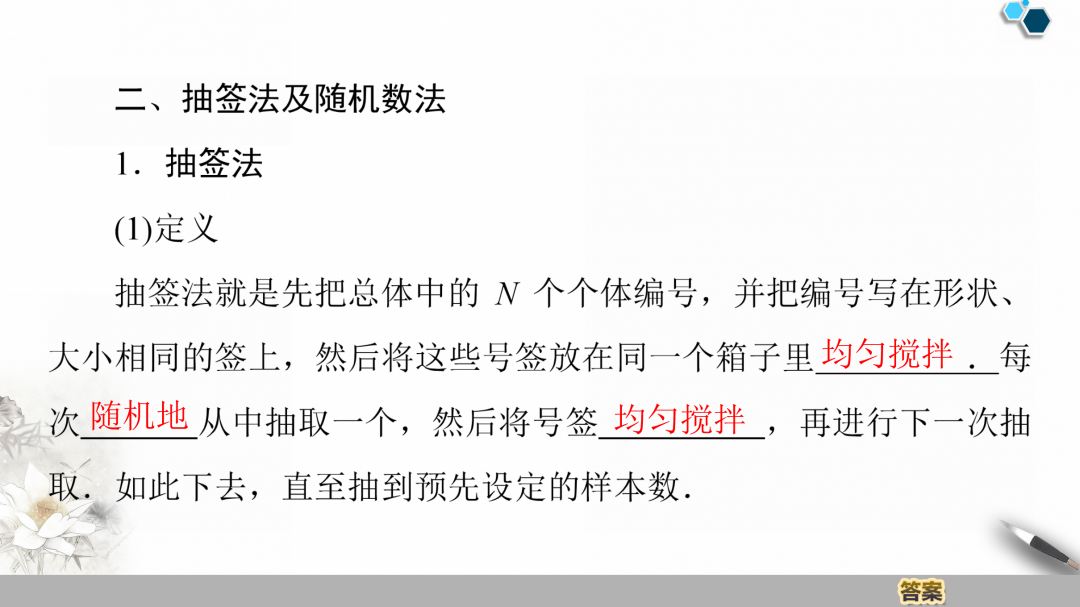 (1)抽签法:把总体的N个个体进行编号,把号码写在号签上,将号签放到一个容器里,均匀搅拌后,每次从中抽取一个号签,连续抽取n次,就得到了一个容量为n的样本。