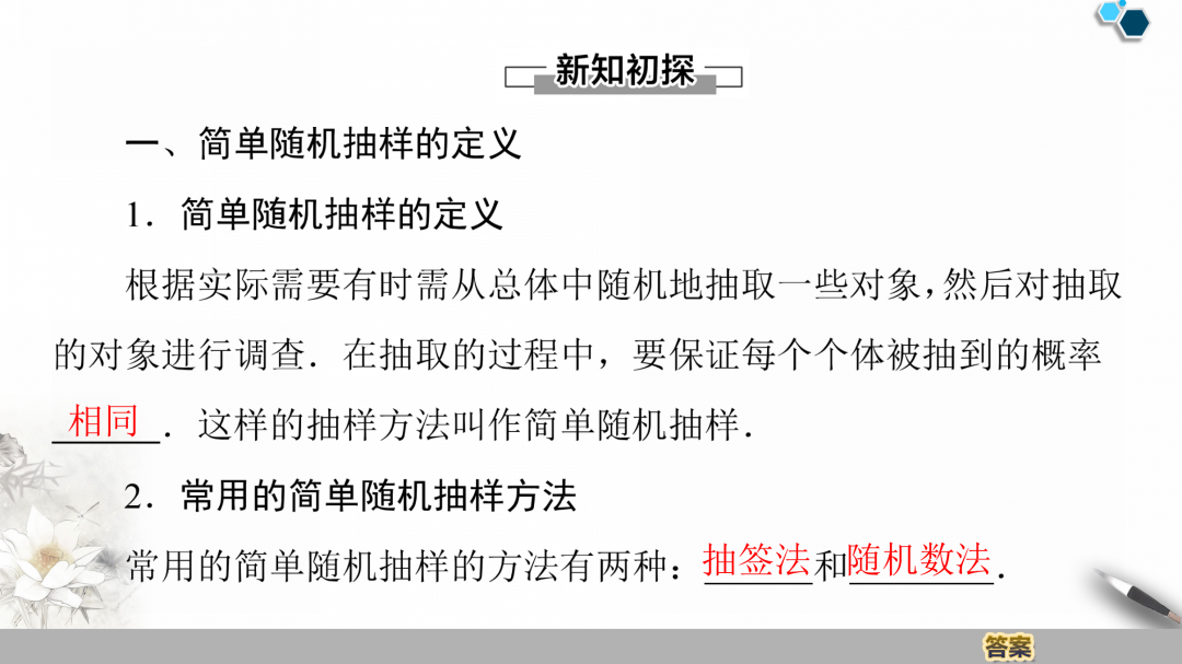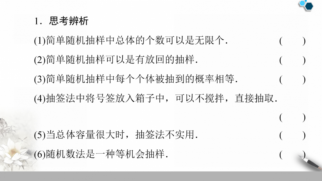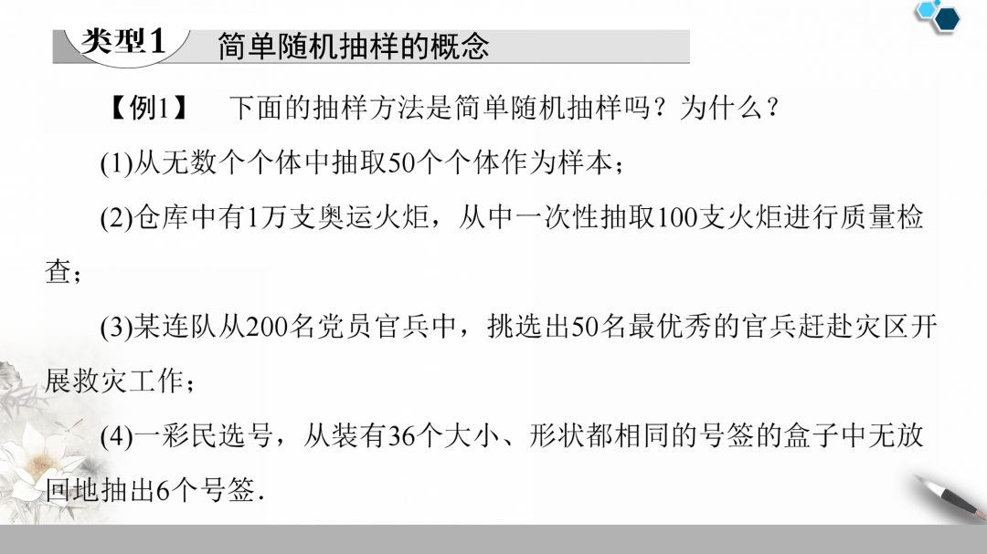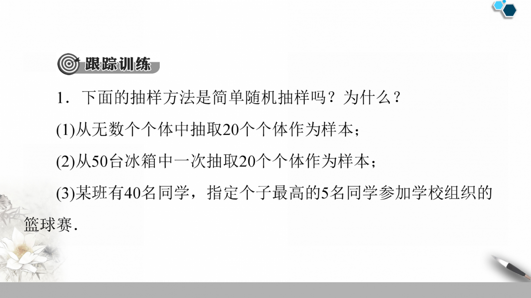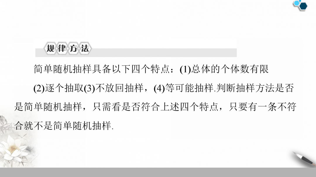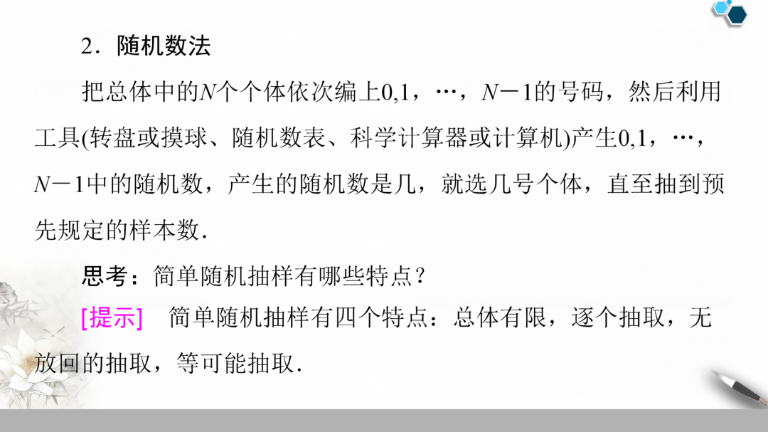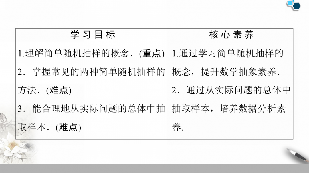 (1)了解简单随机抽样的特点、适用范围及必要性;