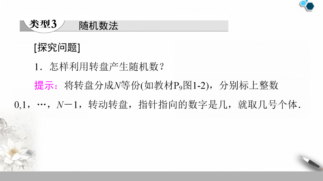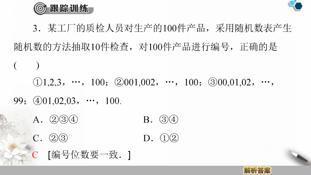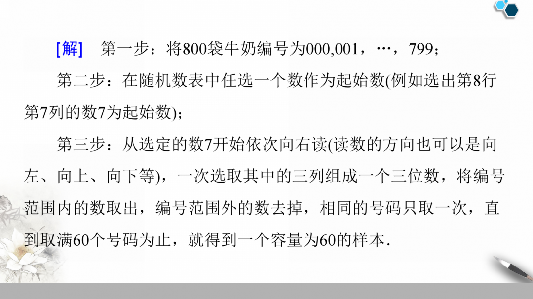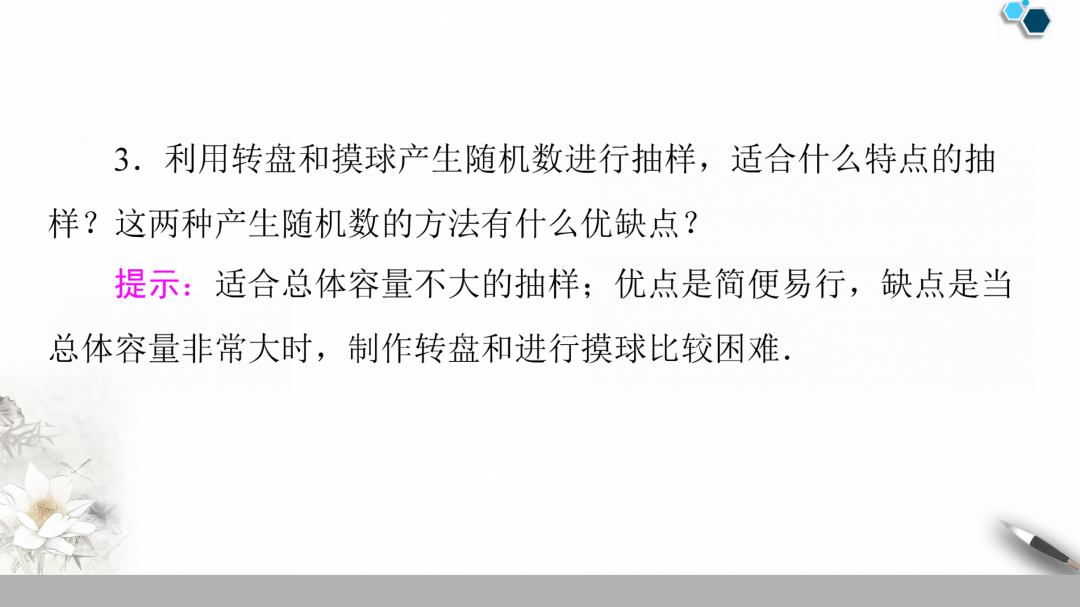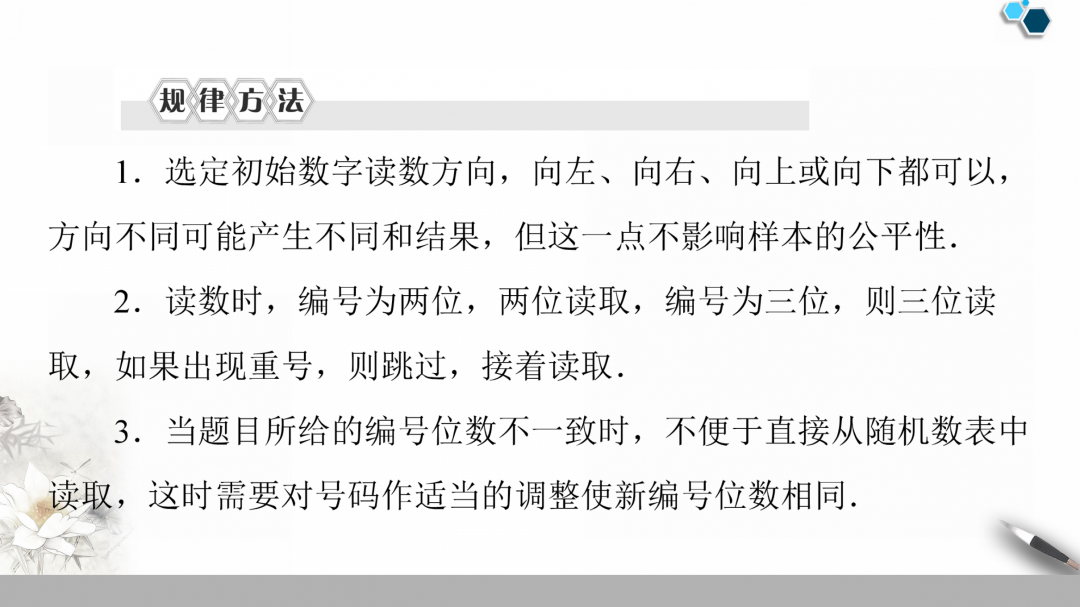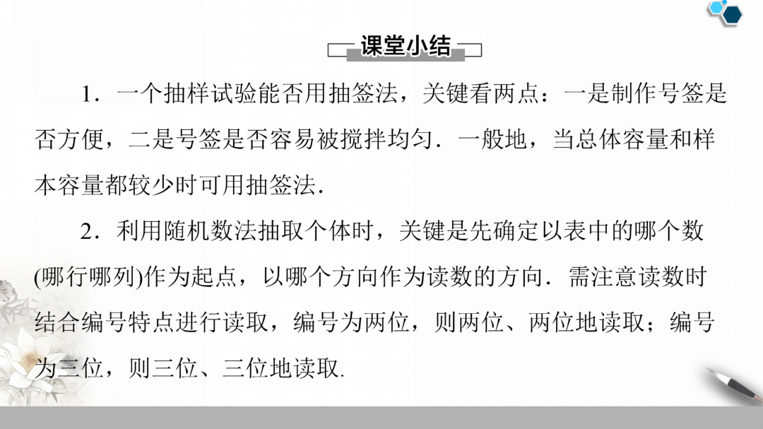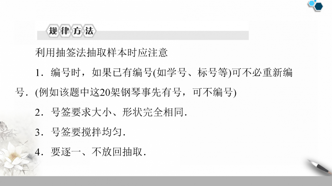 第二步,在1~N的编号中随机产生n个编号:抽签法是通过逐个不放回地抽签,共抽,次,也可以一次同时抽取n个签,产生n个编号;随机数法利用试验或信息技术工具,按照设定的程序产生n个不重复的编号.