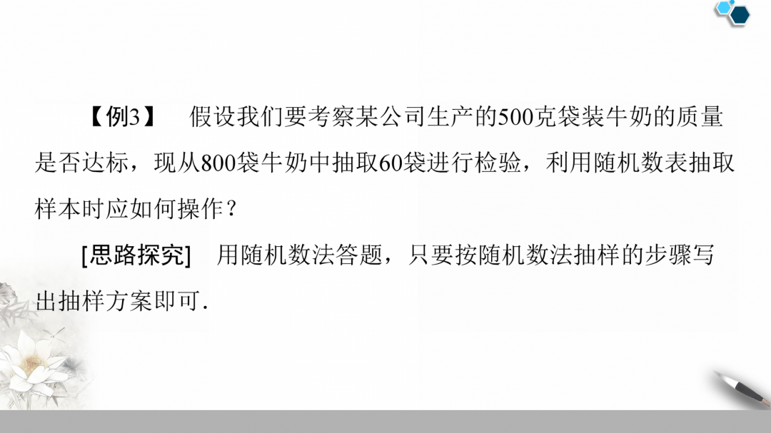1.本小节开头,结合抽样调查一批袋装牛奶的细菌是否超标的例子,明确抽样调查目的是获得对总体情况的了解,强调“好”样本的重要性,抽样调查是一种非全面调查,样本只是总体的一部分,因此样本很难确切地反映总体的情况,用样本估计总体或多或少会存在误差,从对总体估计的角度来看,误差小的样本是“好”样本,而误差大的样本是“坏”样本,因此,为了获得“好”样本或者有代表性的样本,需要研究抽样方法,这是研究抽样方法的一个出发点。