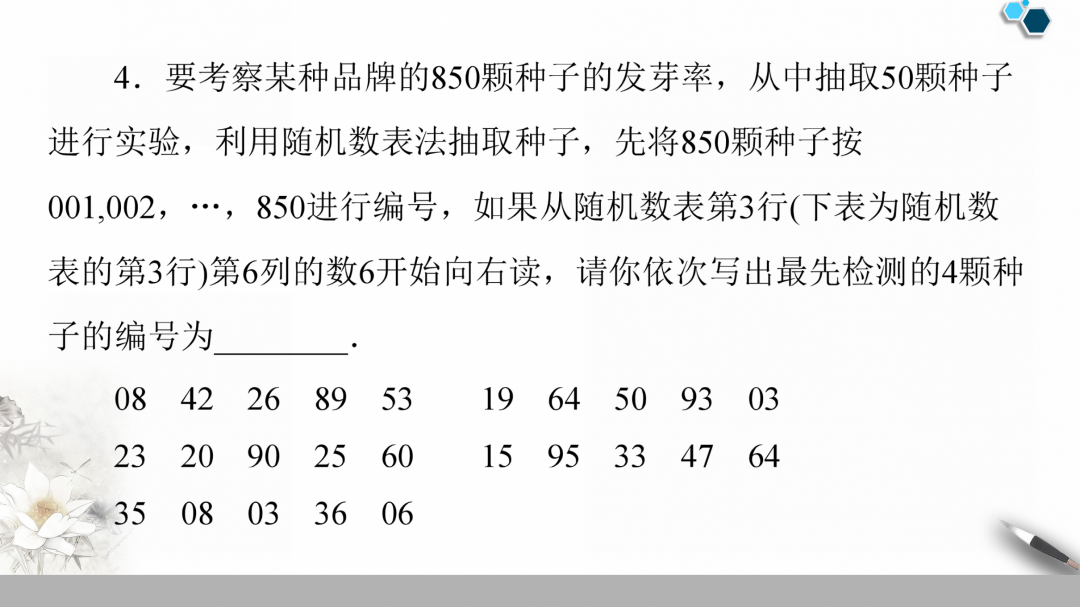 对于用抽签法和随机数法实现简单随机抽样,学生需要掌握具体实施的步骤。在面对一个抽样调查问题时,学生要会选择并使用合适的抽样工具实现简单随机抽样