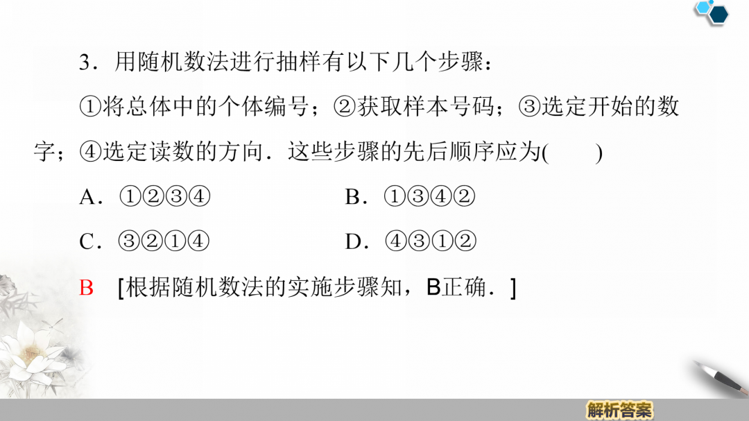 (1)先将总体的N个个体编号。有时可直接利用个体自身所带的号码,如学号,准考证号,门牌号等;