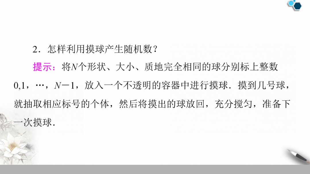 对于根据抽签法产生的随机数的等可能性,学生主要可以根据生活的经验判断,在选择性必修课程中,教科书利用条件概率对此进行了证明,而用信息技术工具产生的随机数是根据一定的算法产生,严格来说是一种伪随机数,但它在统计性质上与真正的随机数几乎无差别,因此在实践中被广泛使用.