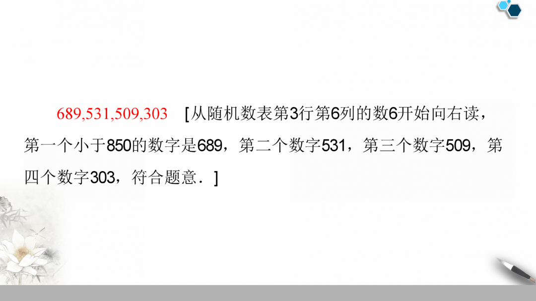 (2)随机数法:即利用随机数表,随机数骰子或计算机产生的随机数进行抽样。随机数表由数字0,1,2,……,9组成,并且每个数字在表中的各个位置出现的机会都是一样的。