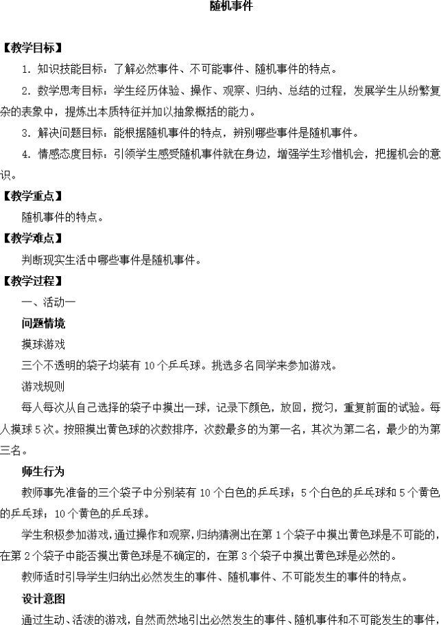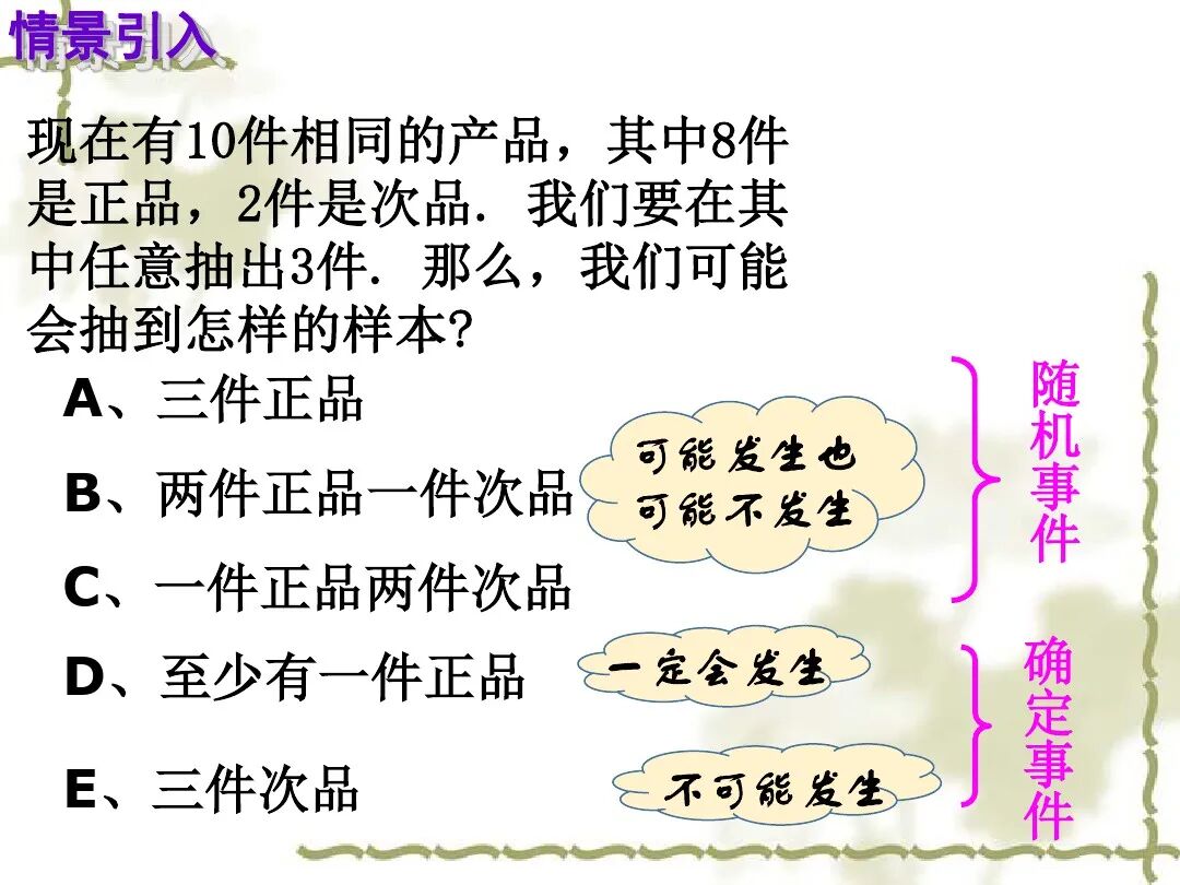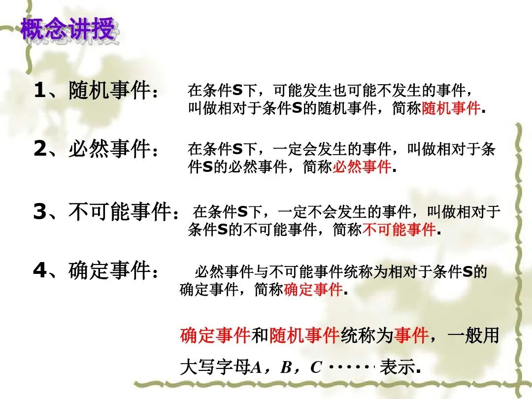 在随机试验中,可能出现也可能不出现,而在大量重复试验中具有某种规律性的事件叫做随机事件.用英文大写字母A、B、C等表示.