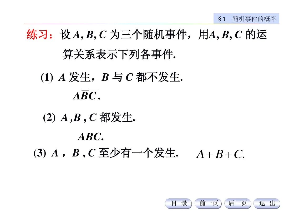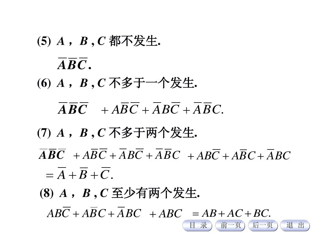 解:(1) ABC ;(2) ABC ;(3) ABC ;(4) ABC 或 A ∪ B ∪C ;(5) A∪ B ∪C 或 ABC ∪ ABC ∪ ABC ∪ ABC ∪ ABC ∪ ABC ∪ ABC ;(6) ABC ∪ ABC ∪ ABC ;(7) ABC ∪ ABC ∪ ABC ∪ ABC .
