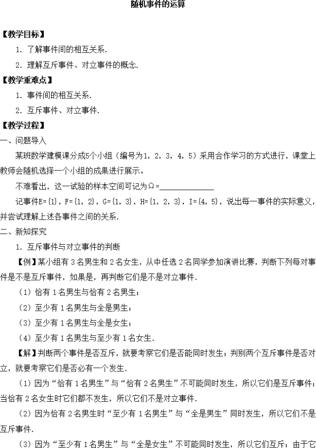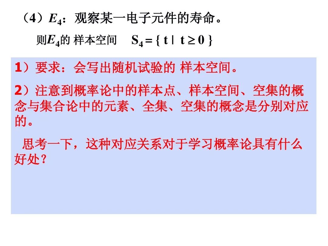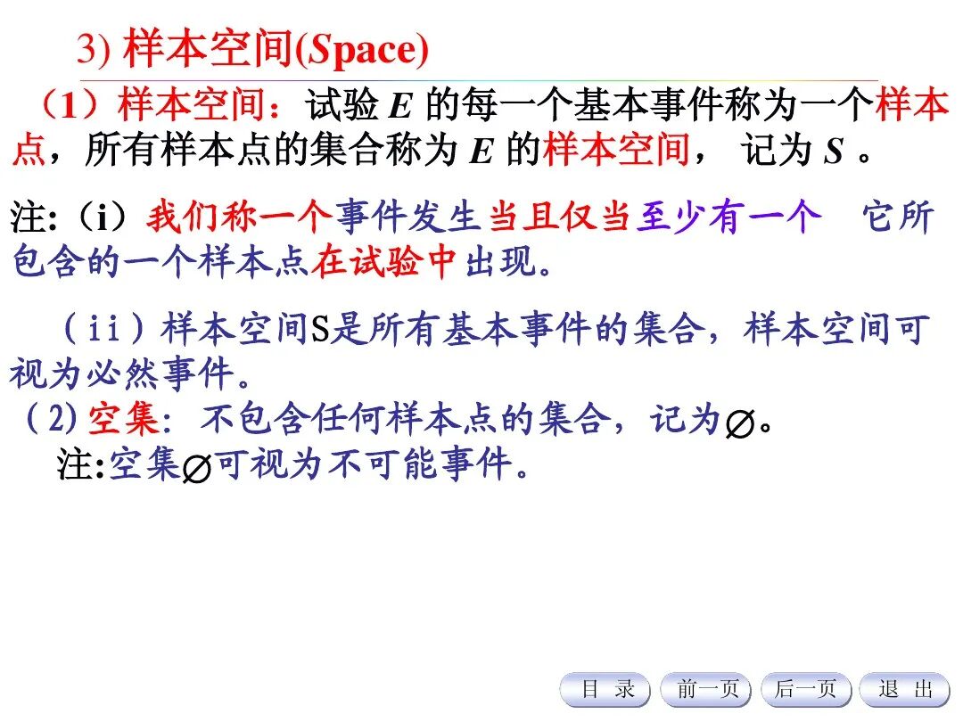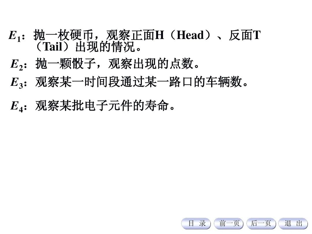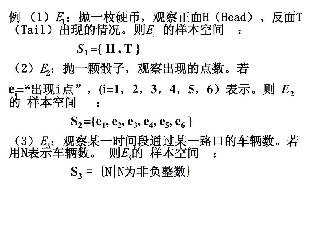解:(1)在有放回情况之下:Ω = {1, 2, 3,L}在无放回的情况之下:Ω ={1, 2, 3,L, 8}(2)记录平均分, } 50100 , ,50503 , 502 , 50 { 0, 1 × Ω = L(3)记录点数之和,Ω = { 3, 4, 5,L,18}(4)单位圆中任取点(x, y),其坐标满足 x 2 + y 2 ≤1,故样本空间为Ω = {(x, y) | x 2 + y 2 ≤1}(5)由于单位圆的面积为π ,故切成的三块面积 x, y, z 应满足:x + y + z = π ,从而所求的样本空间为:Ω = {(x, y, z) | x + y + z = π , x > 0, y > 0, z > 0 }.