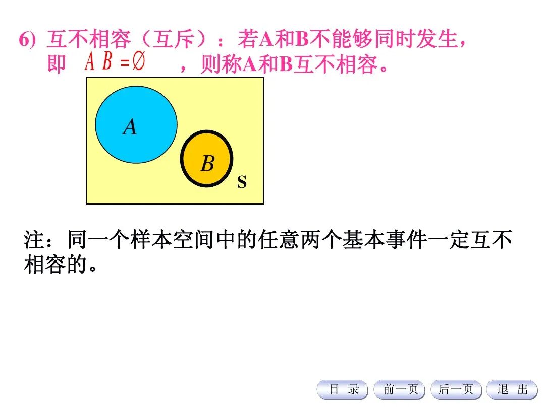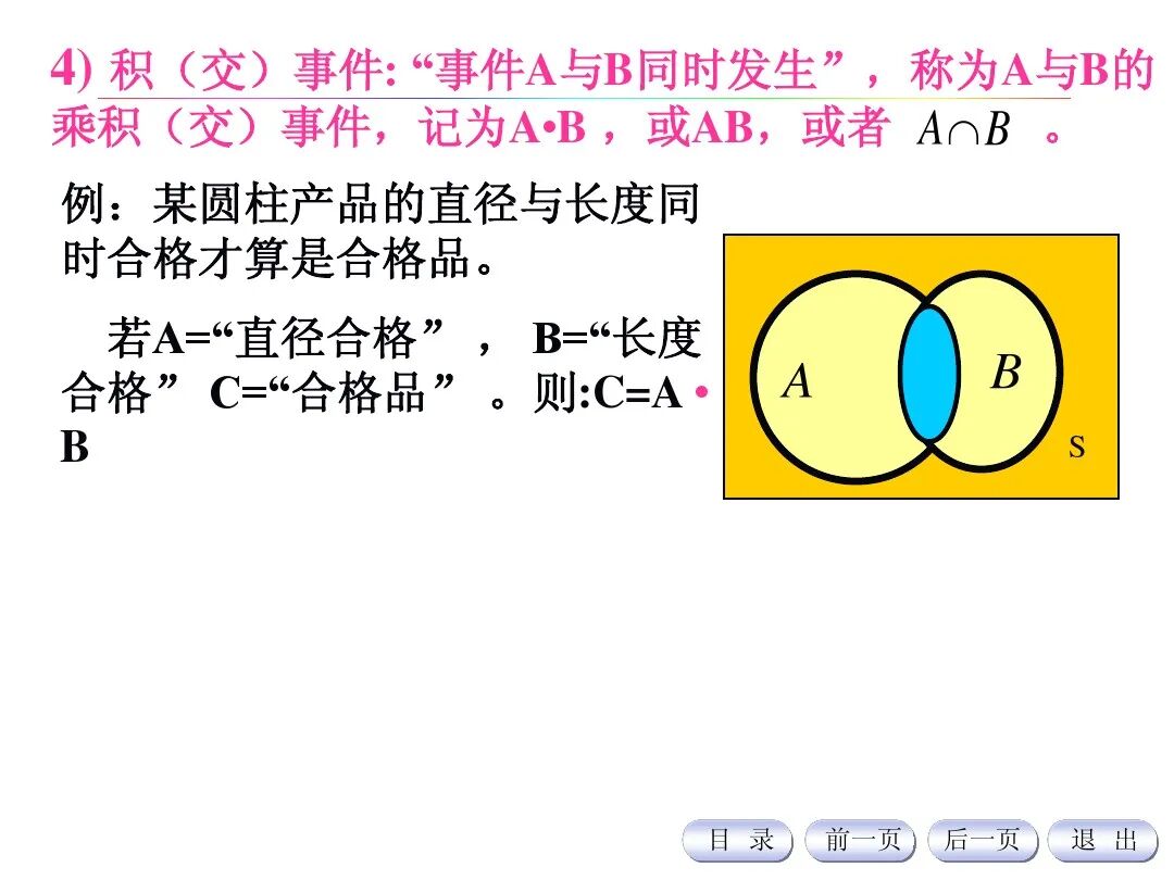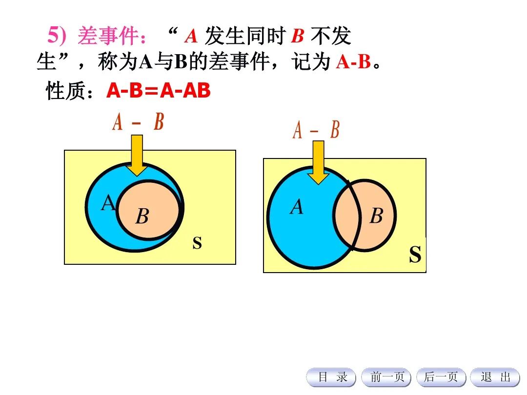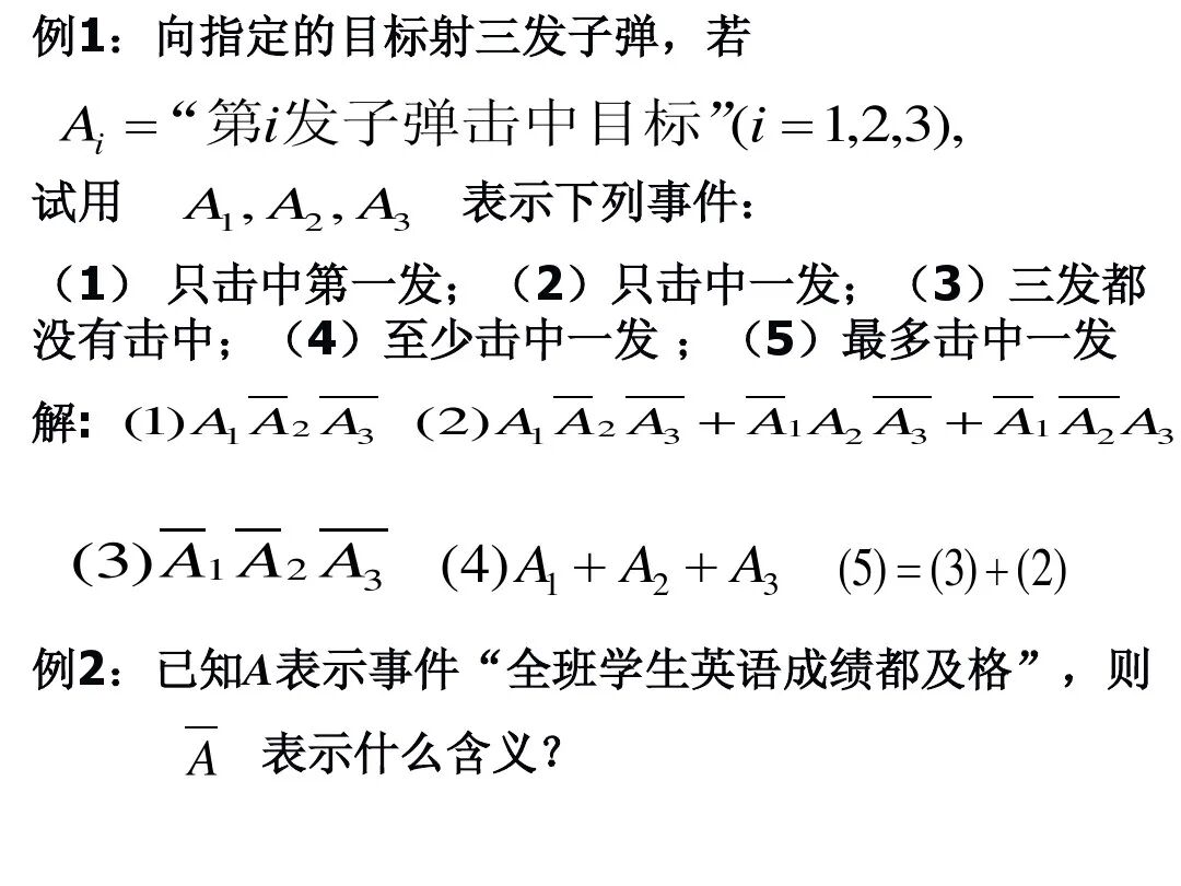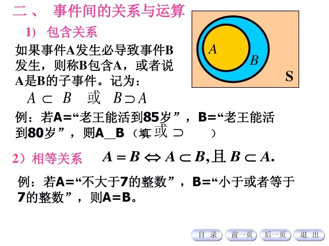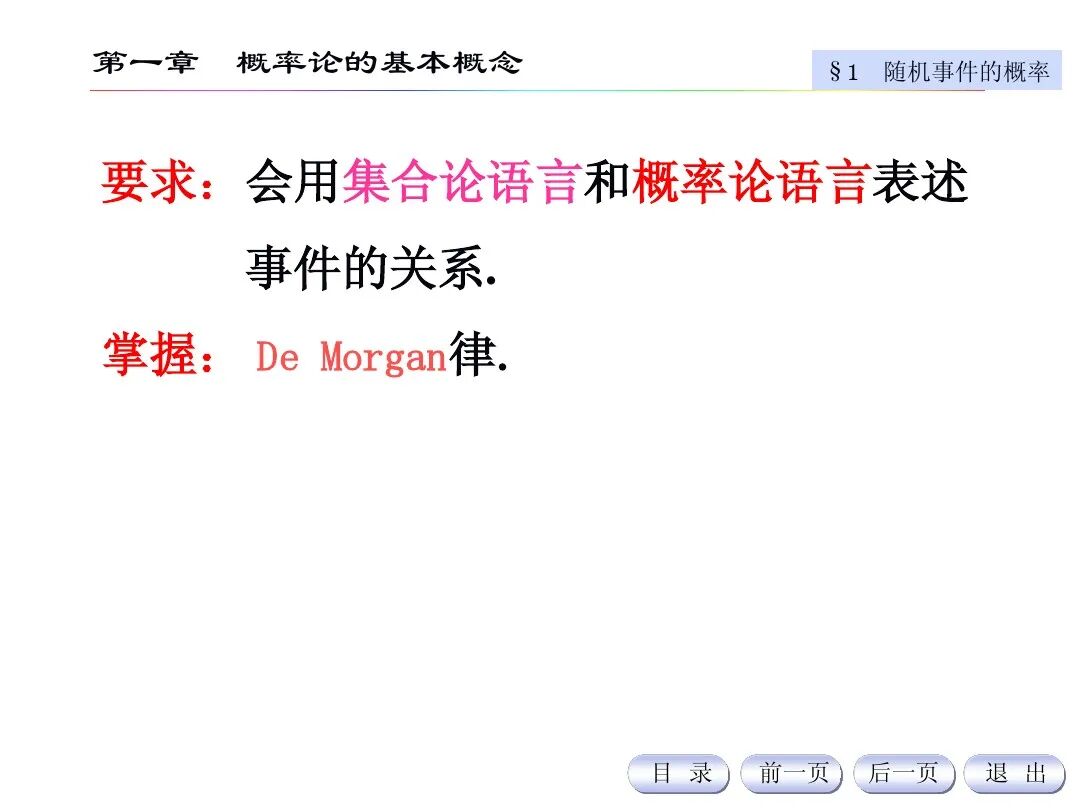 解:(1) A∩ B ∩C 表示事件{ 1999 年或 1999 年以前出版的中文版数学书};(2)若 ABC = A,则 A ⊂ BC ,从而只有在事件{馆中的数学书都是 1999 年后出版的中文书}发生的条件之下,等式才成立;(3)C ⊂ B 表示馆中 1999 年或 1999 年以前出版的书都是中文版的;(4) A = B ⇔ A ⊂ B 且 B ⊂ A ,故 A = B 表示馆中的非数学书都是中文版的,并且中文版的书都不是数学书;又 A = B ⇔ A = B ⇔ A ⊂ B 且 B ⊂ A,故 A = B 又表示馆中的数学书 都不是中文版的,并且所有外文版的书都是数学书。