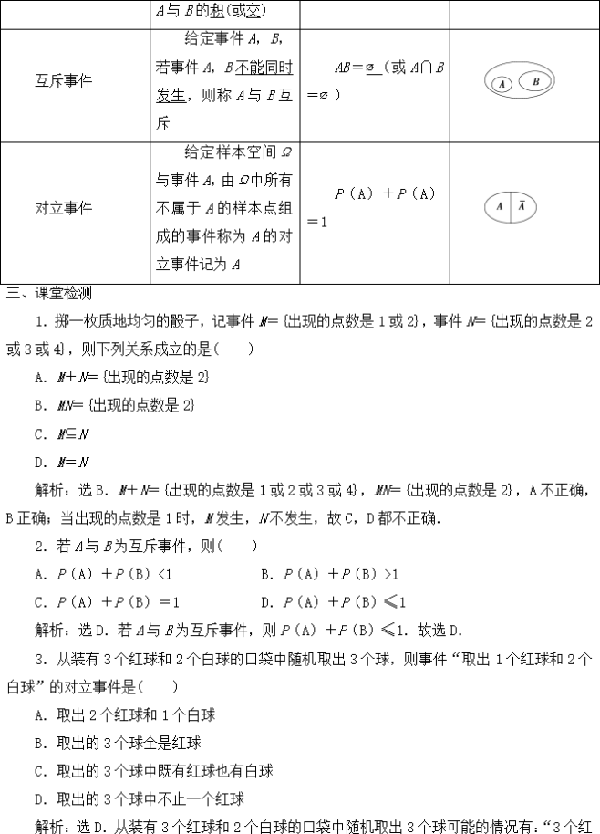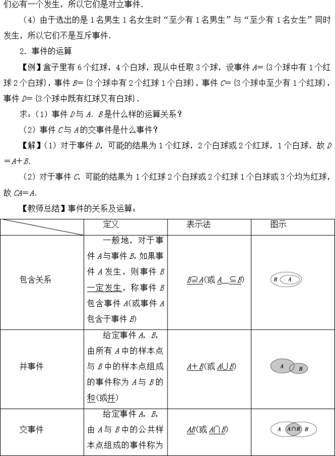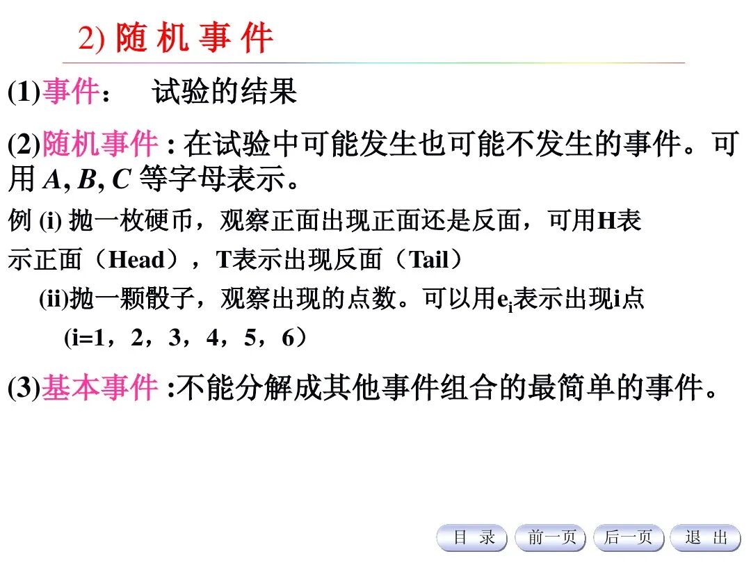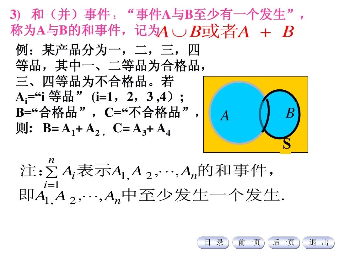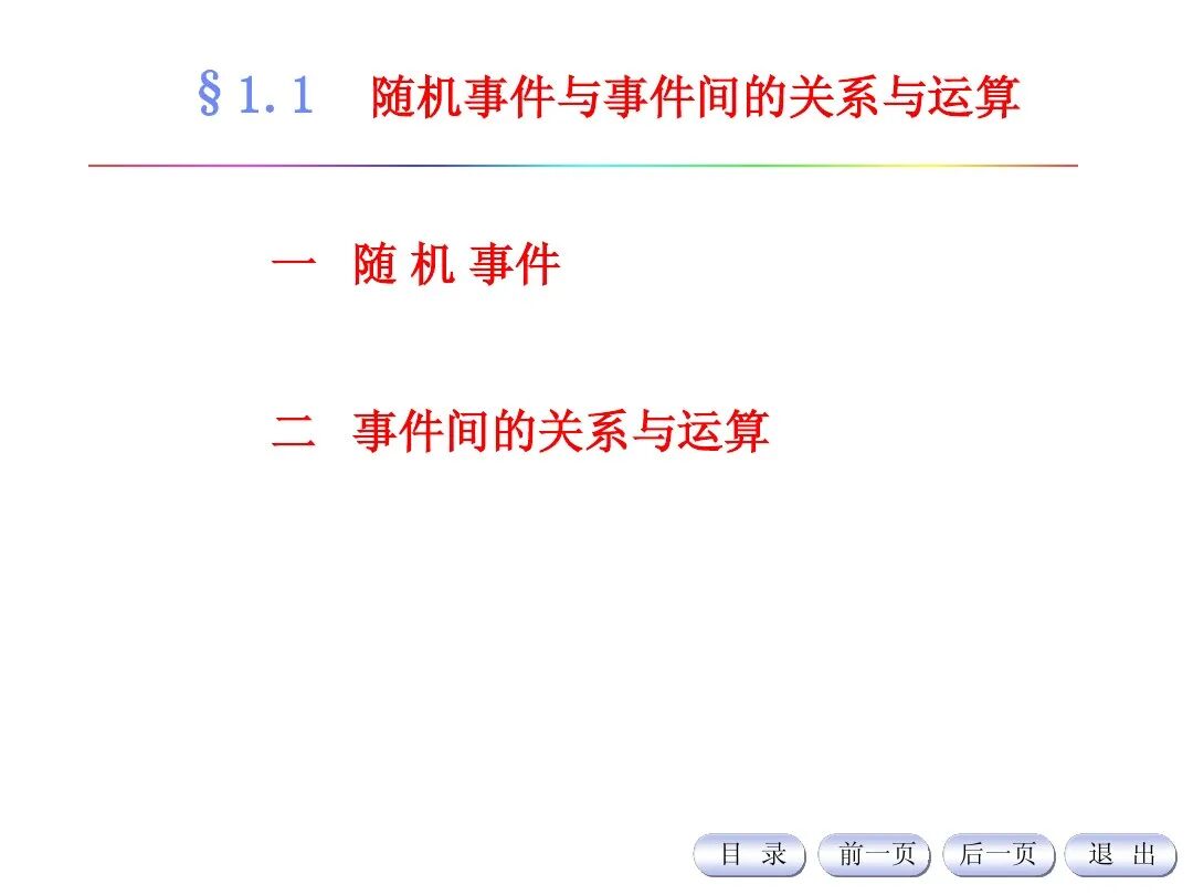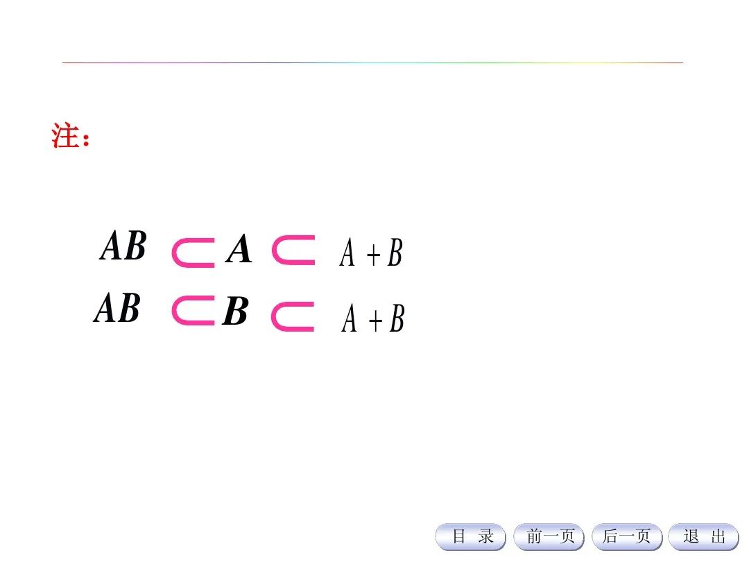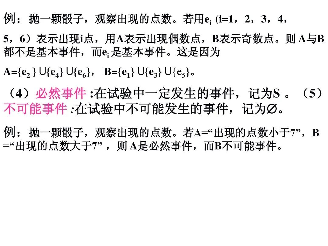 解:(1) A∩ B ∩C 表示事件{ 1999 年或 1999 年以前出版的中文版数学书};(2)若 ABC = A,则 A ⊂ BC ,从而只有在事件{馆中的数学书都是 1999 年后出版的中文书}发生的条件之下,等式才成立;(3)C ⊂ B 表示馆中 1999 年或 1999 年以前出版的书都是中文版的;(4) A = B ⇔ A ⊂ B 且 B ⊂ A ,故 A = B 表示馆中的非数学书都是中文版的,并且中文版的书都不是数学书;又 A = B ⇔ A = B ⇔ A ⊂ B 且 B ⊂ A,故 A = B 又表示馆中的数学书 都不是中文版的,并且所有外文版的书都是数学书。