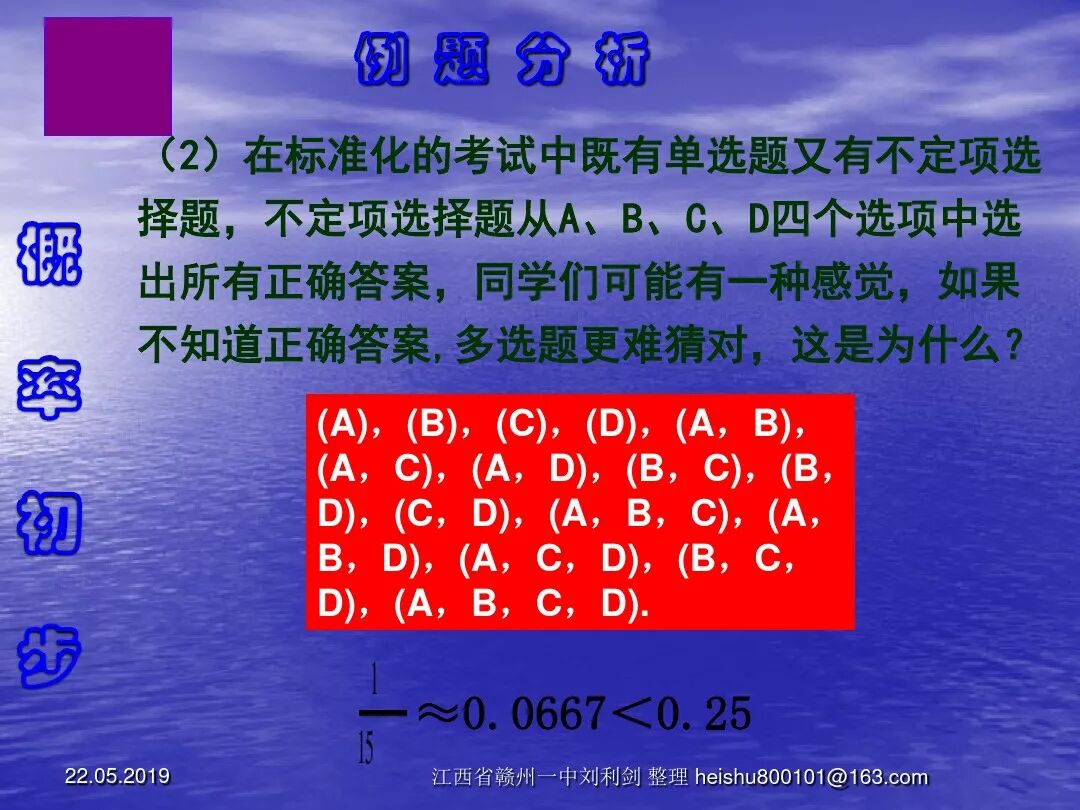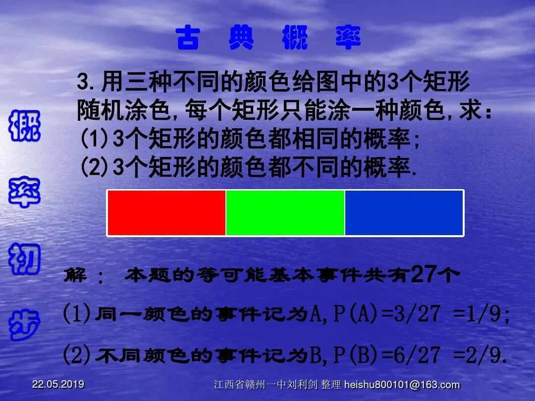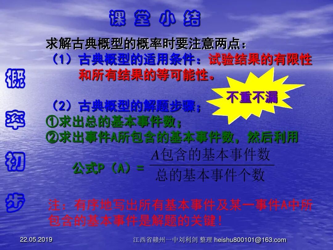 4、课堂小结:本节主要研究了古典概型的概率求法,解题时要注意两点: