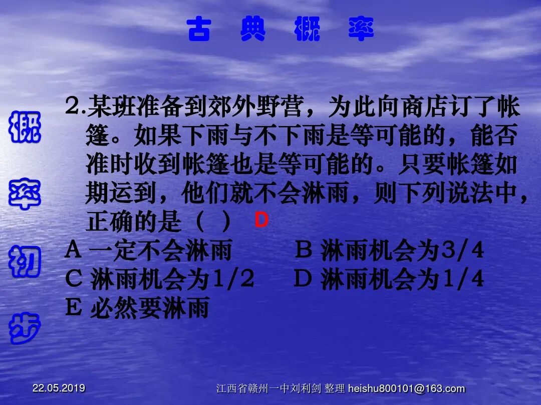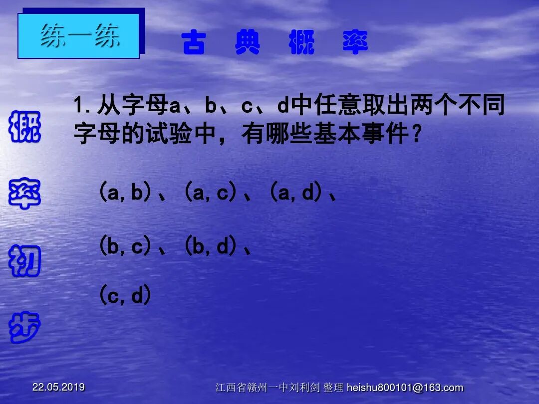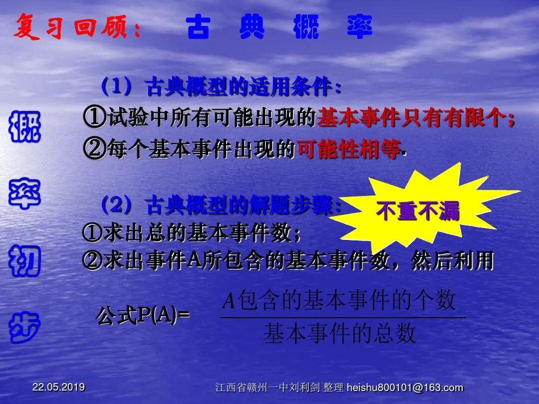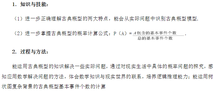 1、知识与技能:(1)正确理解古典概型的两大特点:1)试验中所有可能出现的基本事件只有有限个;2)每个基本事件出现的可能性相等;