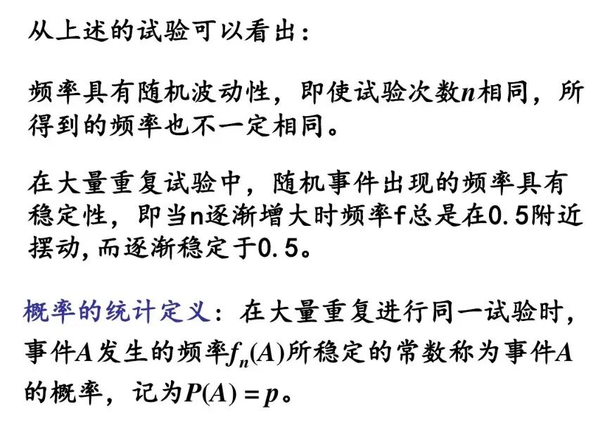 ②做n次随机试验,事件A发生m次,则事件A发生的频率就是事件A发生的概率;