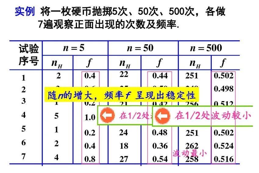 但试验次数多的波动幅度并不全都比次数少的小,只是波动幅度小的可能性更大.