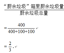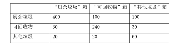 (2)设生活垃圾投放正确为事件A,则A的概率约为“厨余垃圾”箱里可回收物量和其他垃圾量,“可回收物”箱里厨余垃圾量和其他垃圾量,“其他垃圾”箱里厨余垃圾量和可回收物量的总和除以生活垃圾总量.即