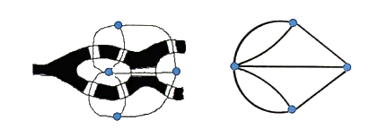 经过反复思考,欧拉想到:岛的形状、大小,以及桥的长短、宽窄并不影响结果,重要的是陆地、桥与岛这三者之间的位置关系.不妨把图中被河隔开的4块陆地看作4个点,连接陆地的7座桥看作7条线,就得到如图的图形.实际问题中的陆地、河流和桥梁景观就不见了,七桥问题就变成能否一笔画出此图形的问题.这就是欧拉对七桥问题建立起来的数学模型.