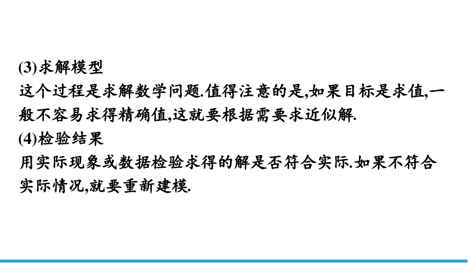 表述是根据建模目的和信息将实际问题“翻译”成数学问题,即将现实问题“翻译”成抽象的数学问题,属于归纳法。数学模型的求解选择适当的数学方法求得数学模型的解答,则属于演绎法。解释是将数学语言表述的数学模型的解答“翻译”回实际对象,给出分析、预报、决策或者控制的结果。最后,作为这个过程的最重要一环——检验,是用现实对象的信息检验得到的解答。