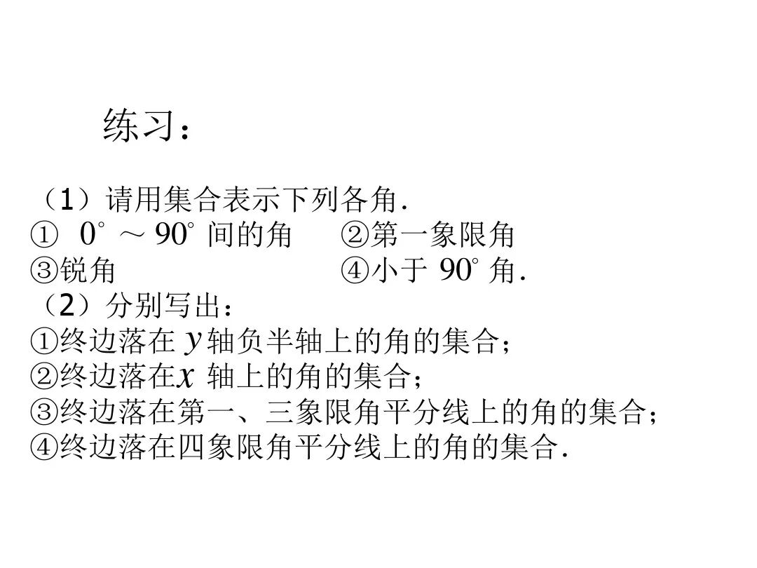 | 作业主要涉及以下重要内容: 1、正角、负角、象限角的基本概念; 2、终边相同的角的概念及终边相同的角的集合表示法。 | 创新提高 温故知新 |