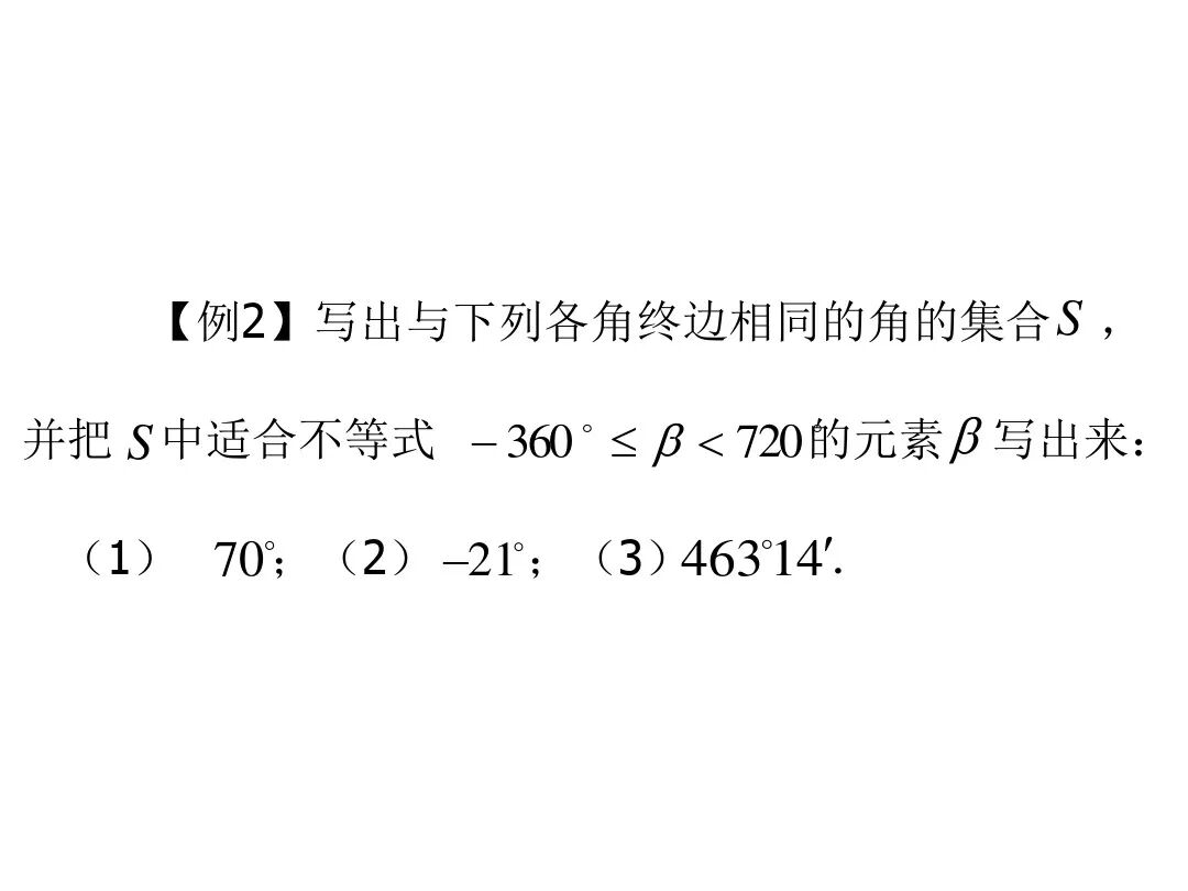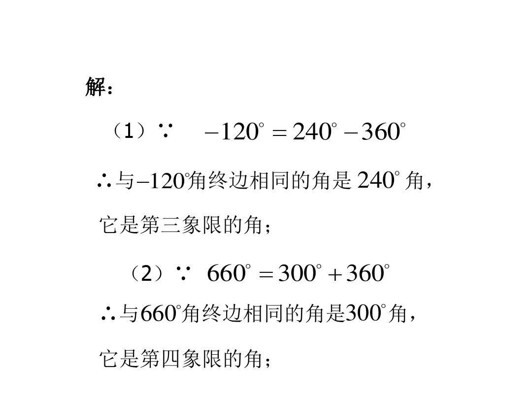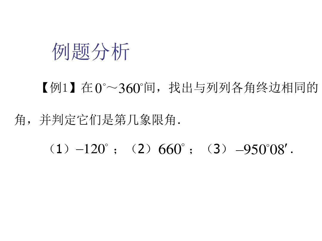 例1让学生学会如何在0°到360°范围内,找出与a角终边相同的角,并判断它是哪个象限的角。