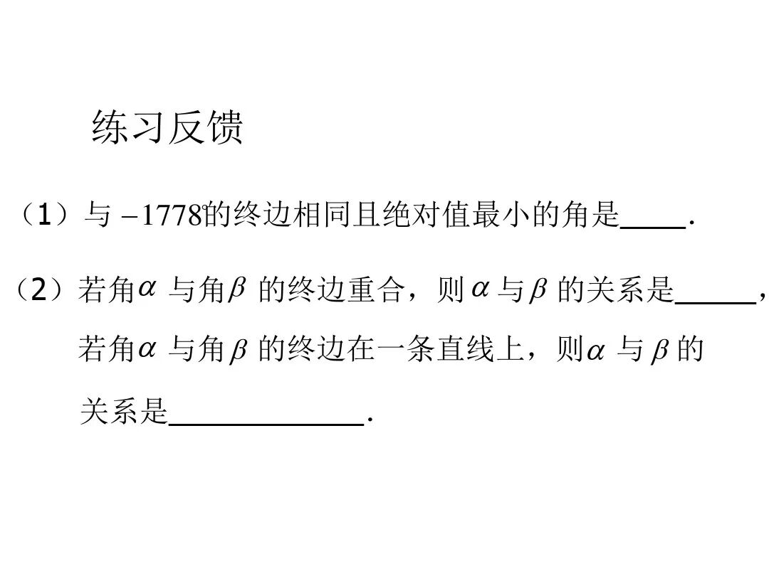 在练习中边引导学生,边总结: (1)终边相同的角有何特点?(相差整数个周角)。