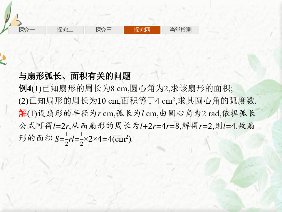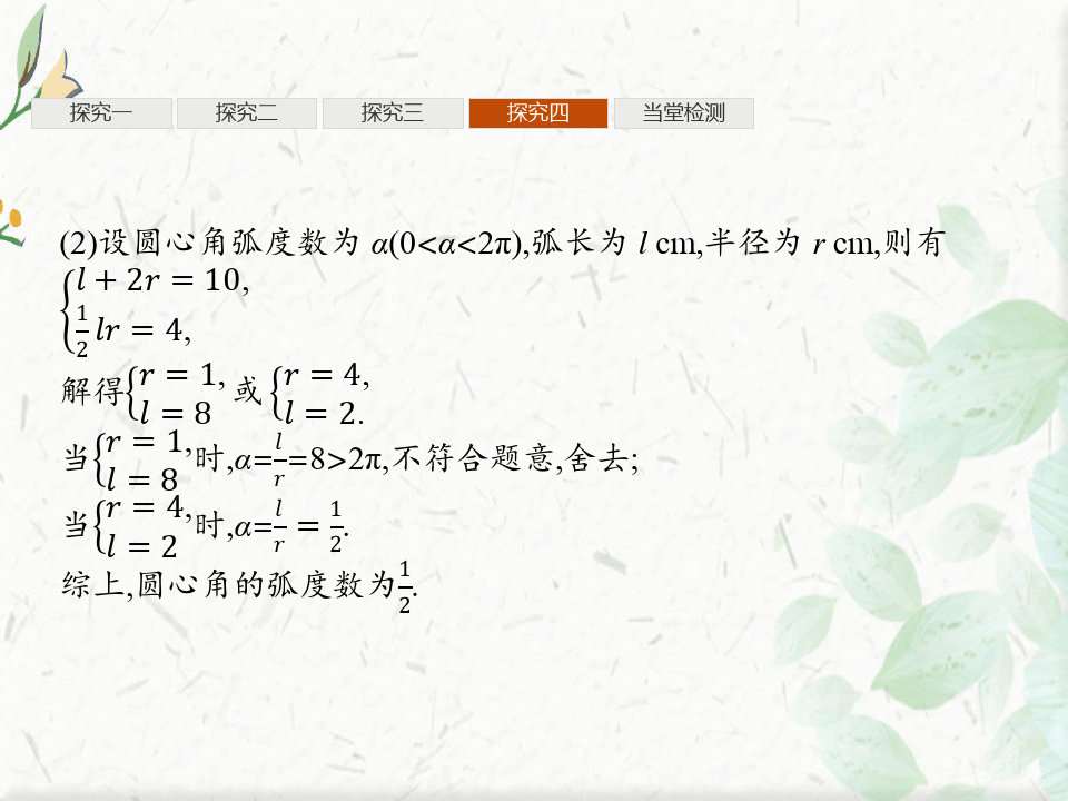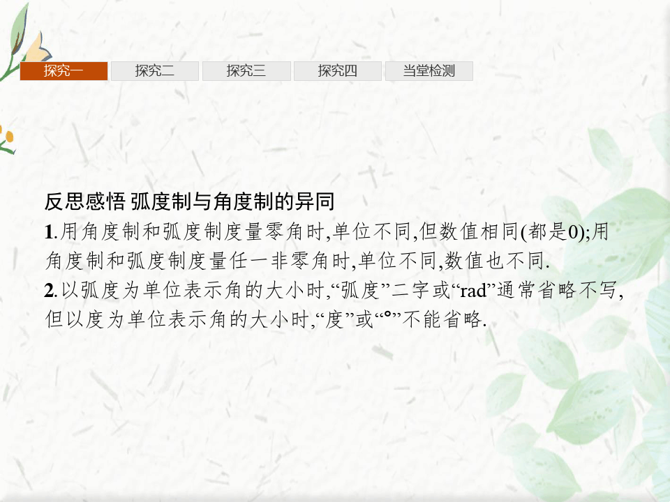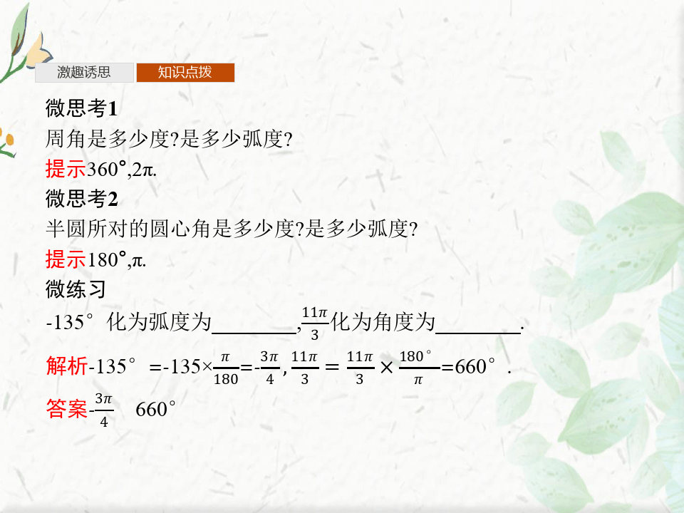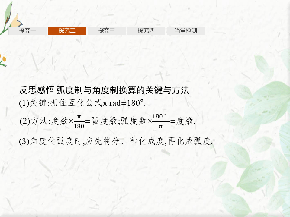 (2)角度制和弧度制的换算。 | 引导学生得出定义和总结两单位制的关系 | 归纳总结角度制和弧度制的关系 | 培养学生归纳总结的能力。 |