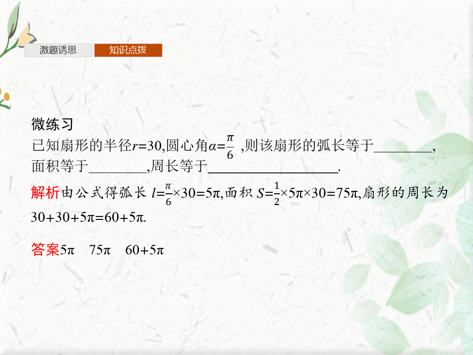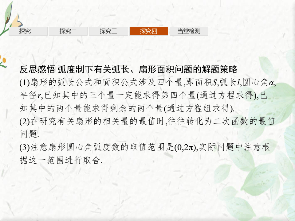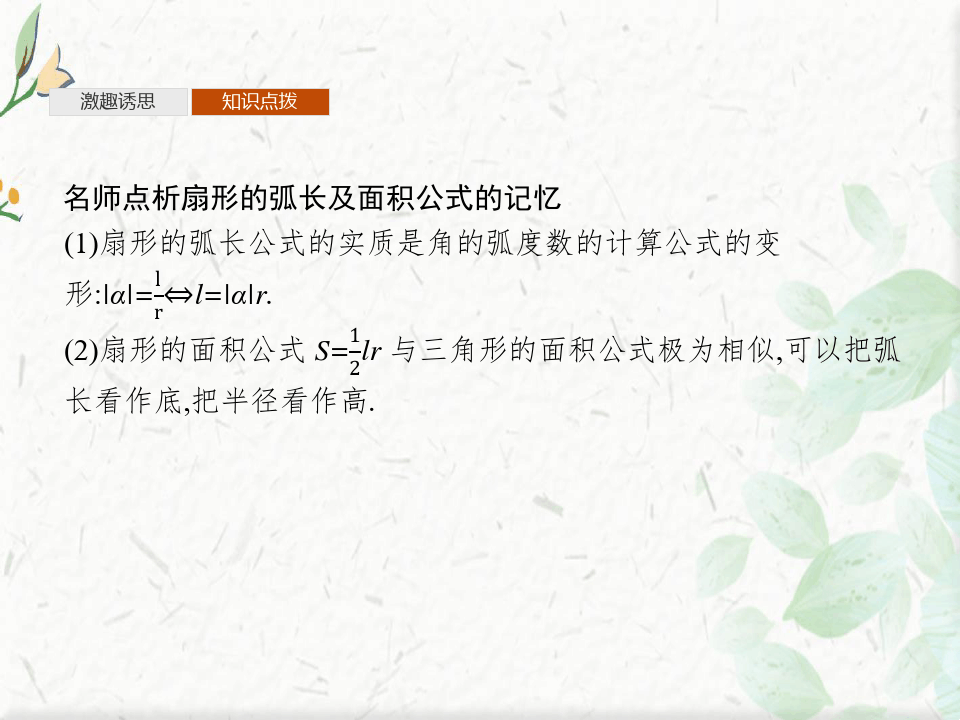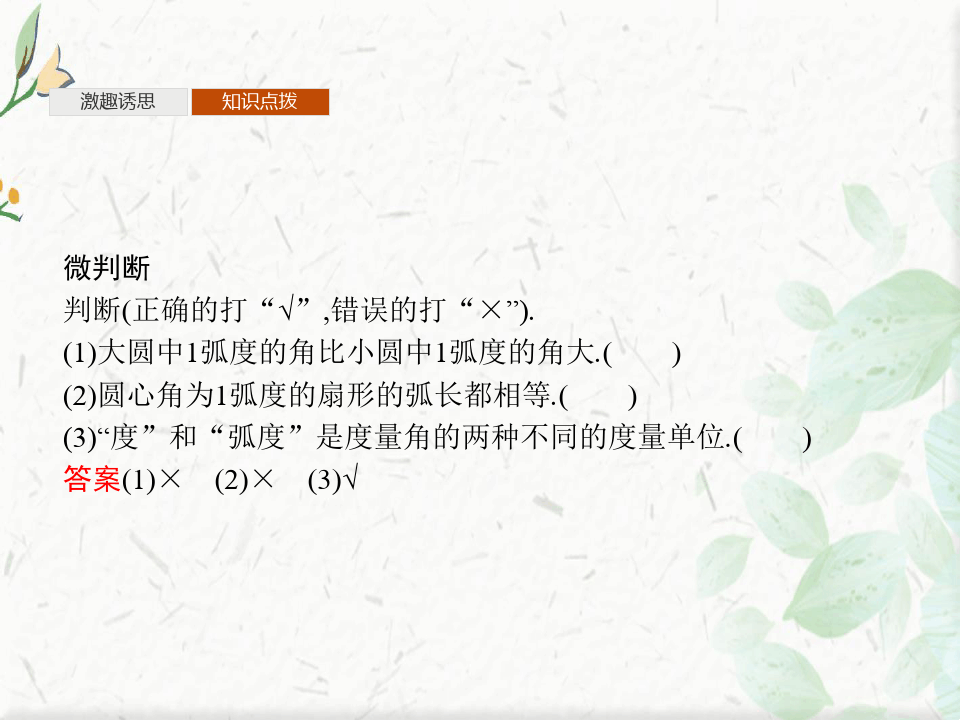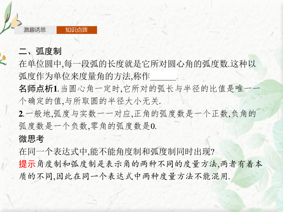 总结、思考 | 引发学生学习趣、激发其好奇心和求知欲; 让学生意识到可以用不同的单位制来度量同一量,从而理解角度制和弧度制都是对角度量的方法。 |