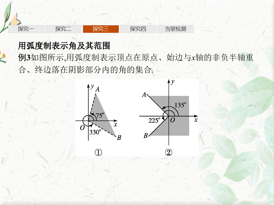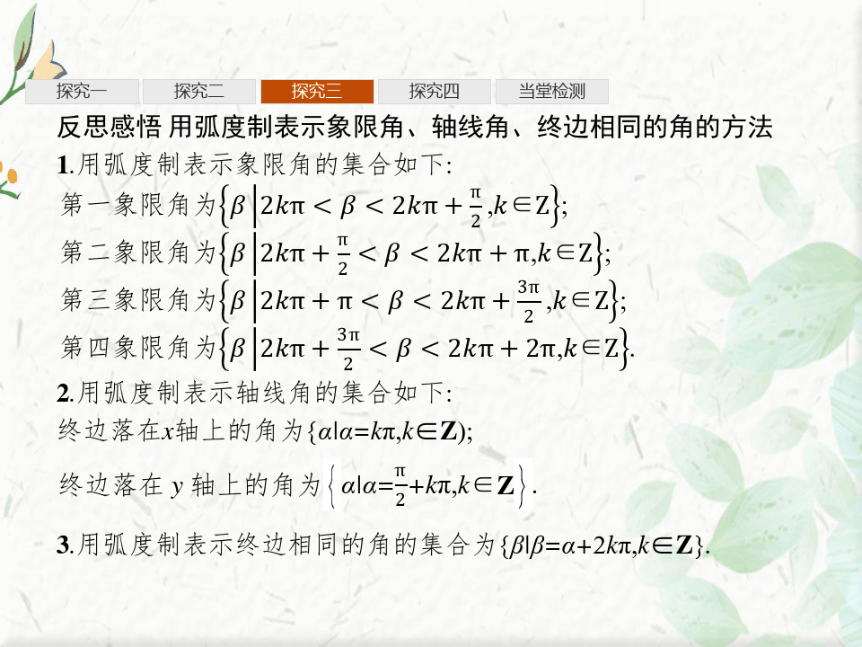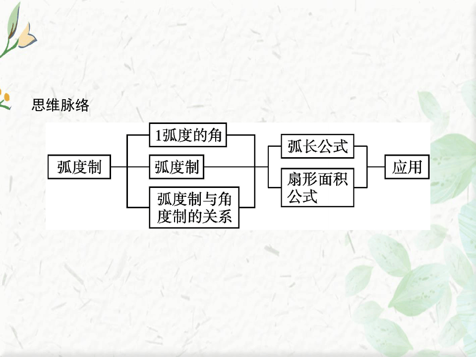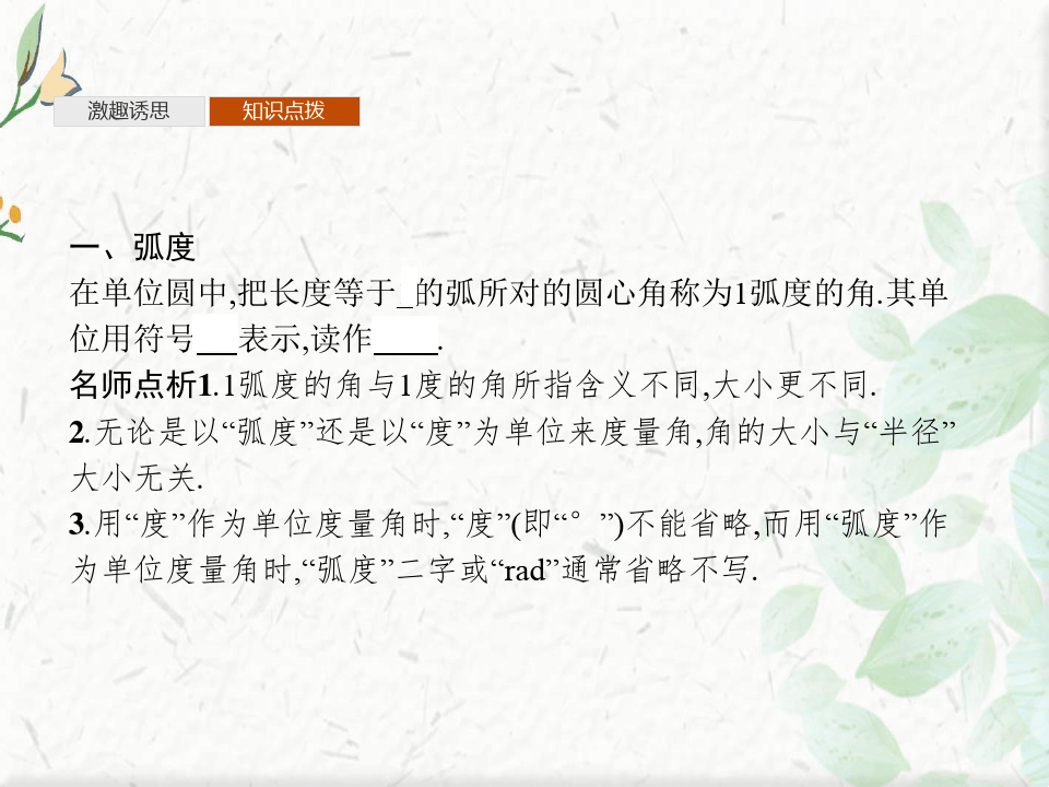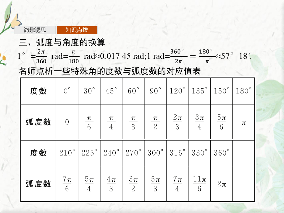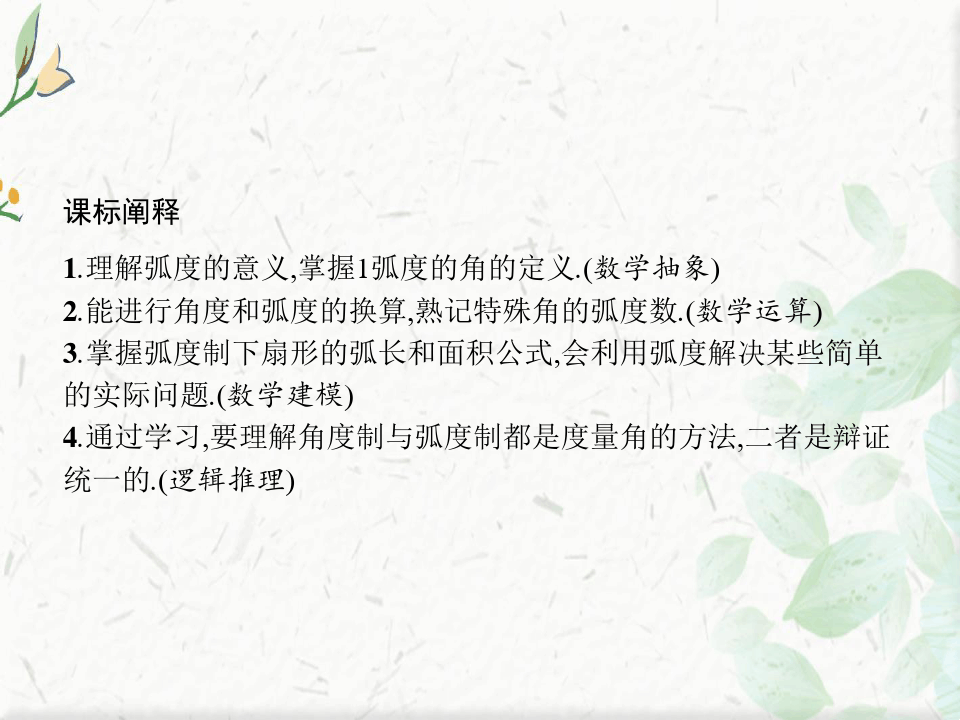 知识与技能 | ①理解弧度的意义, 能正确地进行角度制与弧度制的换算; ②了解角的集合和实数集R之间可以建立起一一对应的关系: ③熟记特殊角的弧度数. |