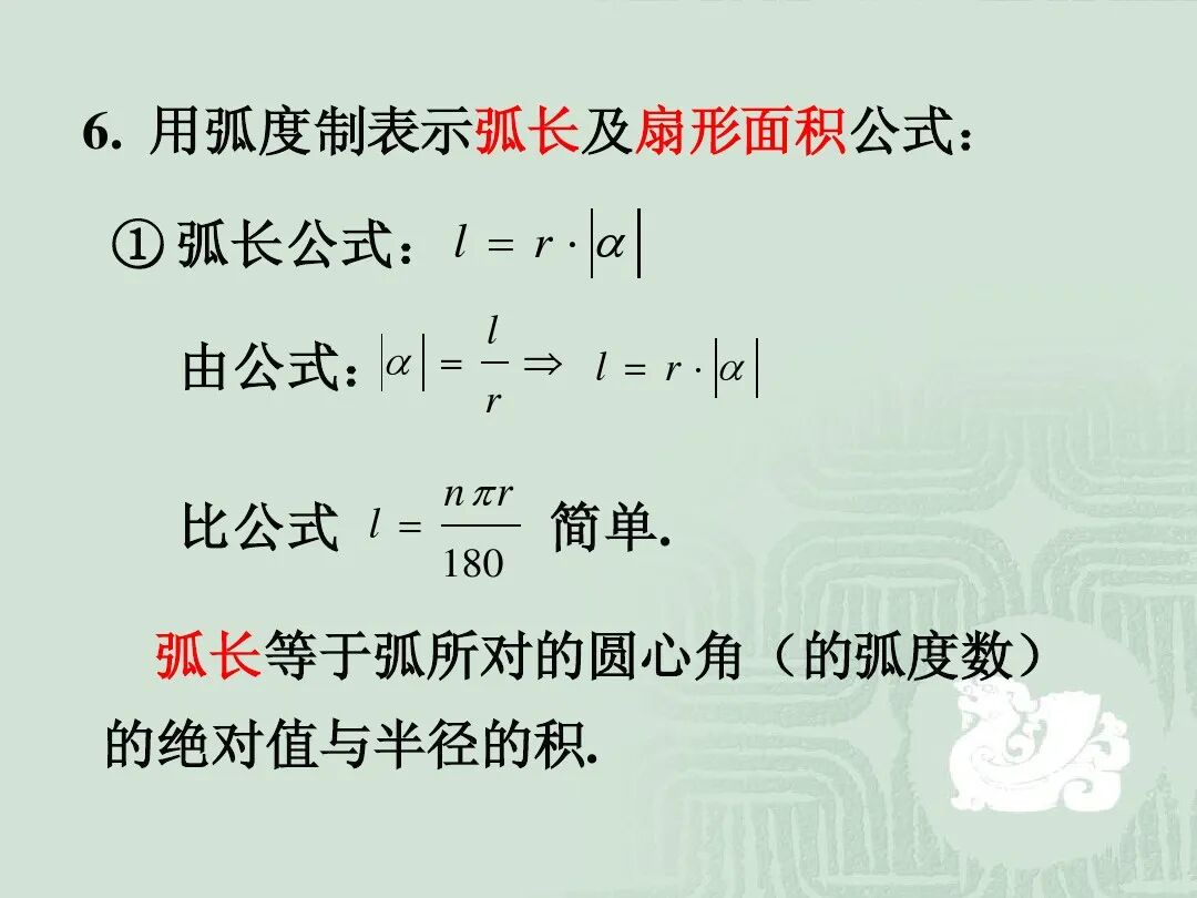 5.弧度制下的弧长公式、扇形面积公式。