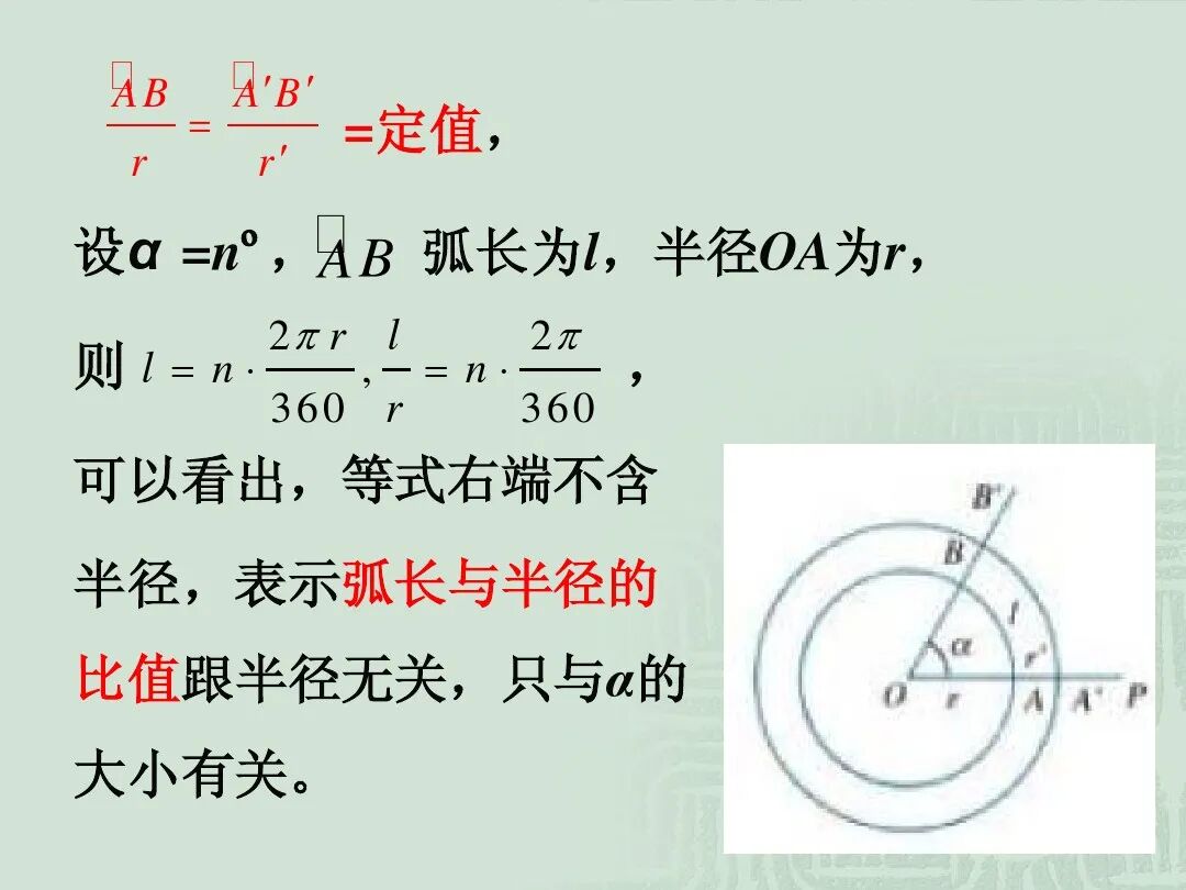 在同心圆中,同一圆心角所对的弧与它所在圆的半径的比值是一个常数,即