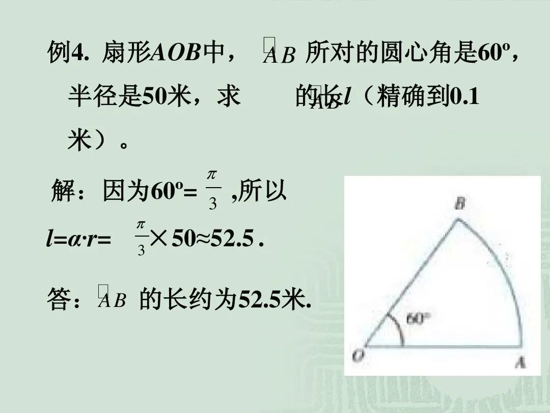 例3 扇形AOB中,所对的圆心角是,半径是50米,求的长(精确到0.1米)。