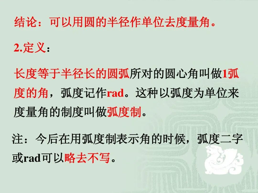 定义:长度等于半径长的圆弧所对的圆心角叫做1弧度的角,弧度记作rad。这种以弧度为单位来度量角的制度叫做弧度制。注:今后在用弧度制表示角的时候,弧度二字或rad可以略去不写。