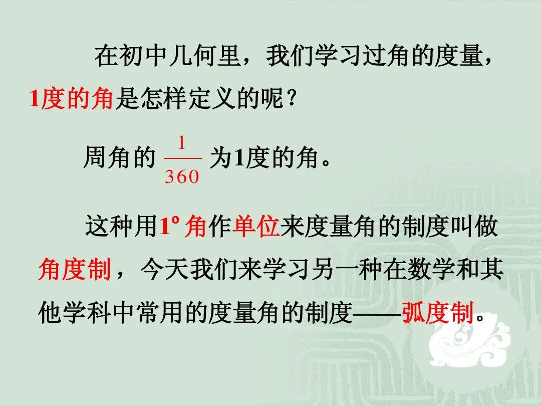 师:在初中几何里,我们学习过角的度量,1度的角是怎样定义的呢?