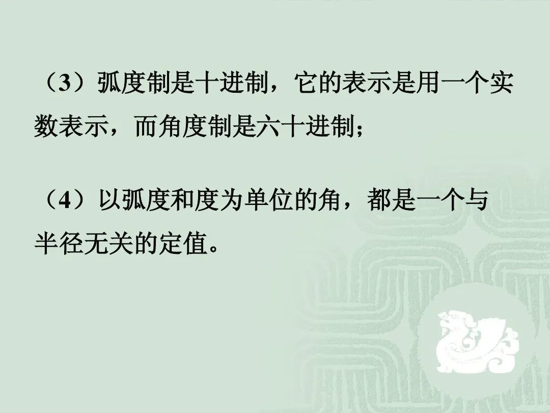 (3)弧度制是十进制,而角度制是六十进制;(4)以弧度和度为单位的角,都是一个与半径无关的定值。