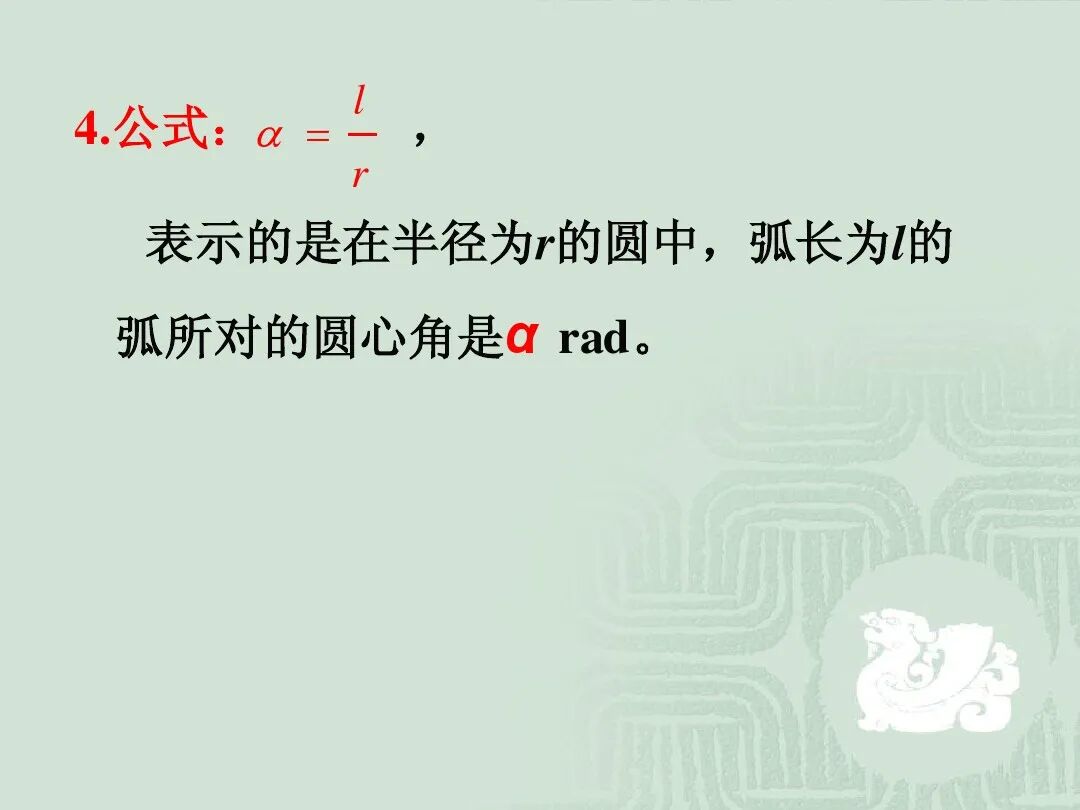 公式:,表示的是在半径为的圆中,弧长为的弧所对的圆心角是 rad。