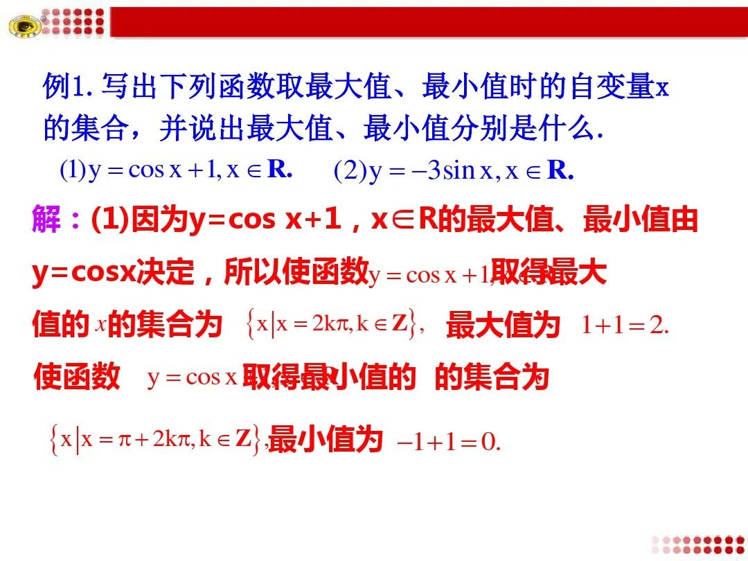 例2 下列函数有最大值、最小值吗?如果有,请写出取最大值、最小值时自变量x的集合,并说出最大值、最小值分别是什么.