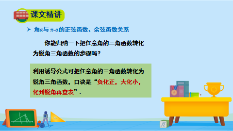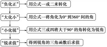 可概括为:“负化正,大化小,化到锐角为终了”(有时也直接化到锐角求值)。