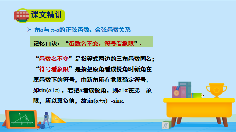 本节主要内容是三角函数的诱导公式中的公式二至公式六,其推导过程中涉及到对称变换,充分体现对称变换思想在数学中的应用,在练习中加以应用,让学生进一步体会的任意性;综合六组诱导公式总结出记忆诱导公式的口诀:“奇变偶不变,符号看象限”,了解从特殊到一般的数学思想的探究过程,培养学生用联系、变化的辩证唯物主义观点去分析问题的能力。诱导公式在三角函数化简、求值中具有非常重要的工具作用,要求学生能熟练的掌握和应用。