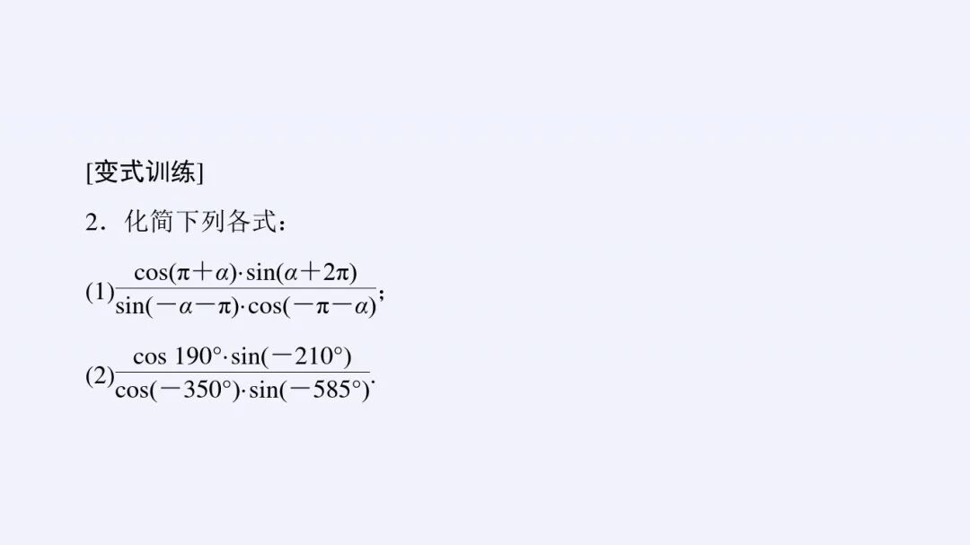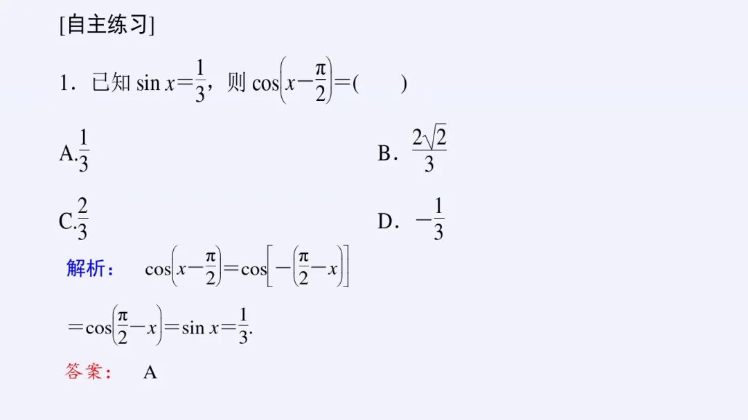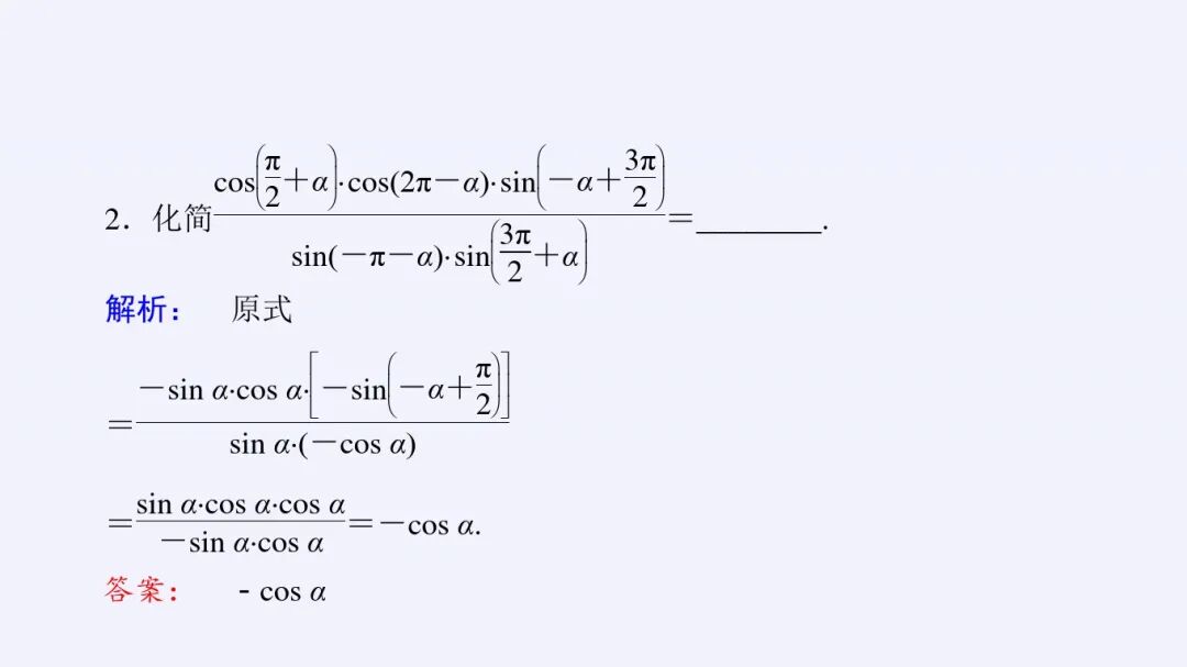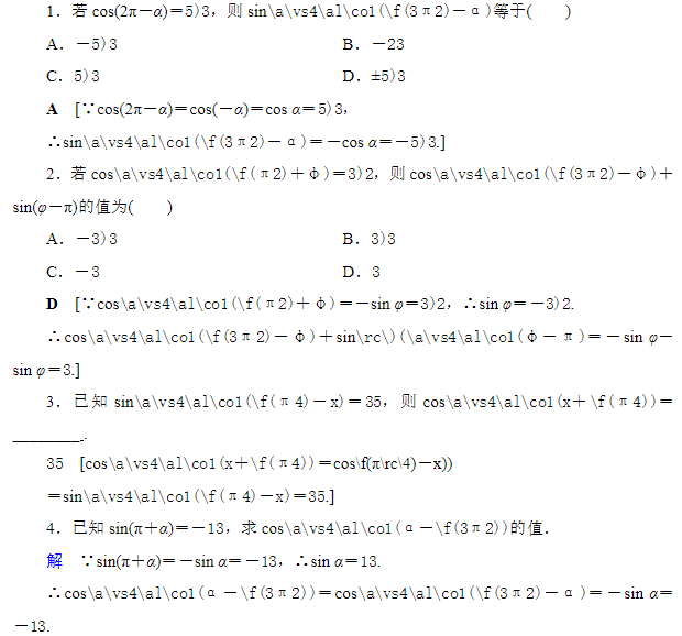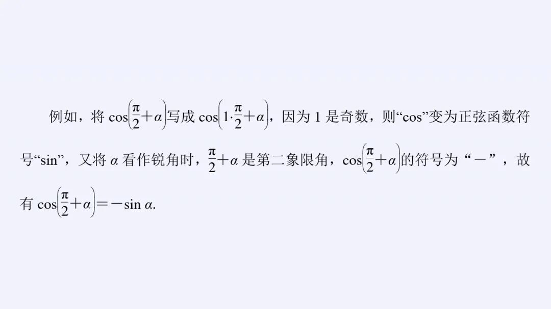 例如,将cos写成cos,因为1是奇数,则“cos”变为正弦函数符号“sin”,又将α看作锐角时,+α是第二象限角,cos的符号为“-”,故有cos=-sin α.