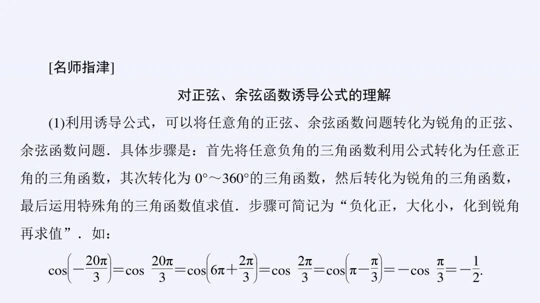 (1)利用诱导公式,可以将任意角的正弦、余弦函数问题转化为锐角的正弦、余弦函数问题.具体步骤是:首先将任意负角的三角函数利用公式转化为任意正角的三角函数,其次转化为0°~360°的三角函数,然后转化为锐角的三角函数,最后运用特殊角的三角函数值求值.步骤可简记为“负化正,大化小,化到锐角再求值”.如:
