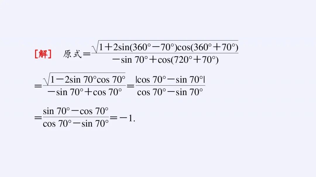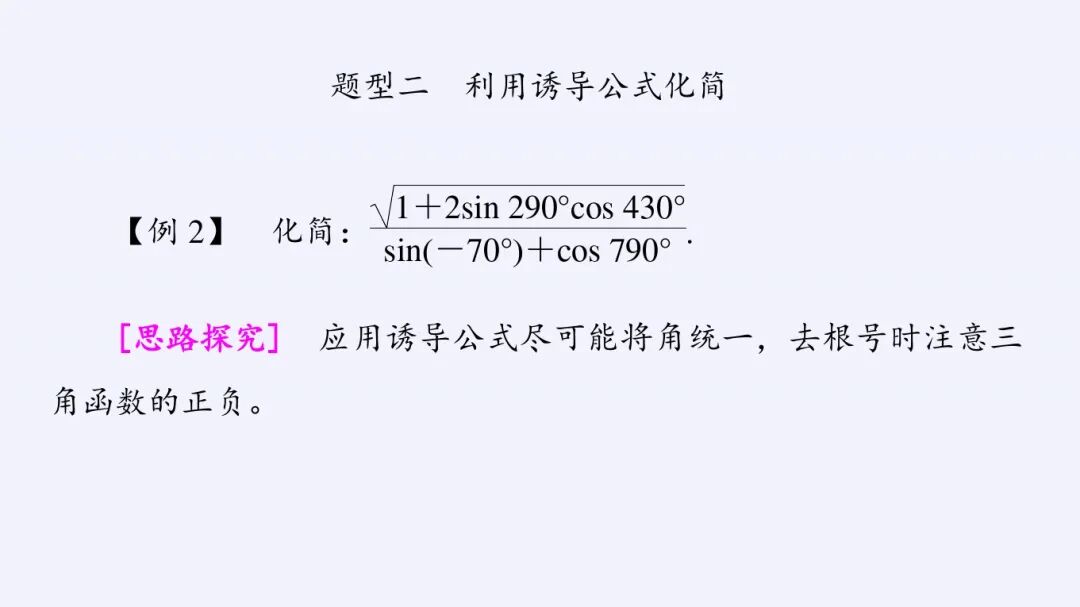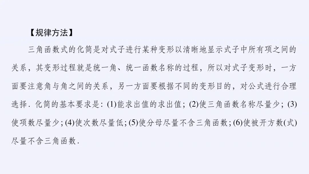 三角函数式的化简是对式子进行某种变形以清晰地显示式子中所有项之间的关系,其变形过程就是统一角、统一函数名称的过程,所以对式子变形时,一方面要注意角与角之间的关系,另一方面要根据不同的变形目的,对公式进行合理选择.化简的基本要求是:(1)能求出值的求出值;(2)使三角函数名称尽量少;(3)使项数尽量少;(4)使次数尽量低;(5)使分母尽量不含三角函数;(6)使被开方数(式)尽量不含三角函数.