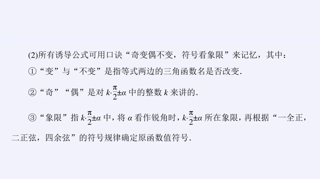 (2)所有诱导公式可用口诀“奇变偶不变,符号看象限”来记忆,其中: