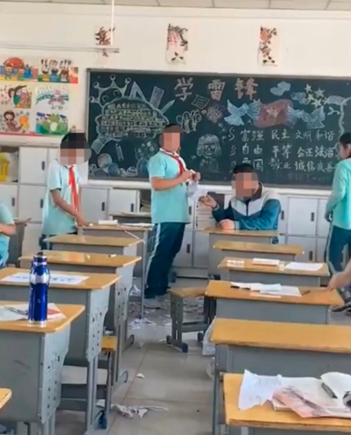 下课后,这名男生当着同学们的面将自己的试卷撕得粉碎,并将碎片洒落了一地。