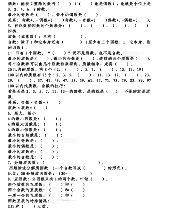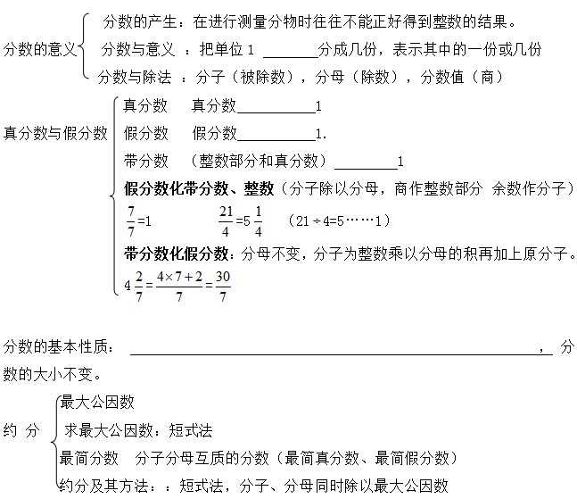 8、最简分数:分数的分子和分母只有公因数1,像这样的分数叫做最简分数。